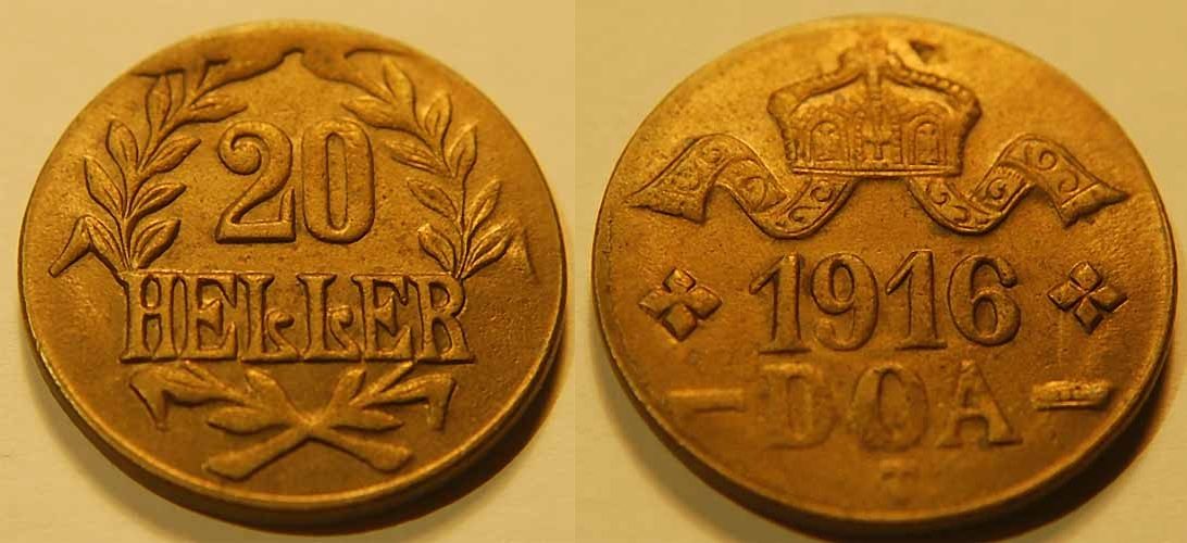 I finally got a type C Reverse 1916 DOA (German East Africa) 20 Heller. It is a Type A Obverse. It is also known as a no error LL. It really should be called a Type A Reverse since this was the first Reverse they minted. The loop on the first L broke off on the master die early on and then most of the remaining 20 Hellers minted on that die were errors and should be called type B IMO, but are called Type A for some reason. There is also a type B Reverse with sharp pointy L's and it is the most common. There are two varieties of the Obverse as well. A large crown like shown here is type A and a the smaller crown variety is type B. Plus these all come in copper or brass making something like 12 varieties. The history of the circumstances that these coins were minted make them extremely interesting to me. Anyway, I have been looking for any type C Reverse for a while now and finally found this one on a Germany website and I really like it.