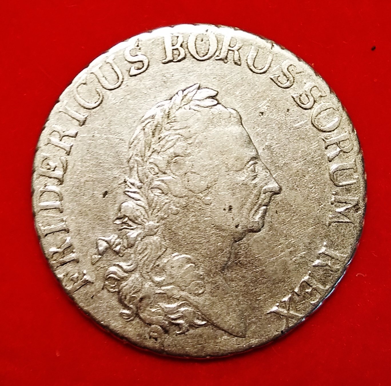 Friedrich II, Kingdom of Prussia These Thalers were struck under Frederick II 'The Great', king of Prussia from 1740 until his death in 1786. The Thaler contains 0.537 troy ounces of silver. Several different mint marks were used, spanning from the letters A through to F. This type, issued in Breslau and Berlin 1750-52, is the second Thaler issued by Frederick the Great after the very rare type of 1741 (Davenport 2581). AR, Reichstaler, Breslau (Today Wroclaw, Poland), 1751 38 mm, 21.87 g Ref.: Olding 28 b; v. Schrötter 182 b, Davenport 2583; KM 256 Ob.: FRIDERICVS BORVSSORUM REX, Laureate portrait right Rev.: EIN REICHSTALER 17 (B) 51 Crowned eagle flying (open wings), looking to the left above; right two and left three banner points and one with a much older portrait: Berlin, 1777 38 mm, 22.03 g Ref.: Olding 70; Kluge 123.3; v. Schrötter 463; Davenport 2590 Ob.: FRIDERICVS BORVSSORUM REX, Laureate portrait right Rev.: EIN REICHSTALER 17 (A) 77 Crowned eagle flying (open wings) over flags and canons, looking left above; to right and left banner points and some small pocket change: AR, ⅓ Thaler, Breslau, 1773 29 mm, 8.11 g Ref.: Olding 88; v. Schrötter 550; KM 303 Ob.: FRIDERICVS BORVSSORUM REX, Laureate portrait right Rev.: 3 EINEN REICHS THALER 1773 within palm and laurel branches. Mint mark B (3 einen thaler means one-third of a Thaler)