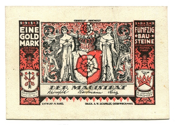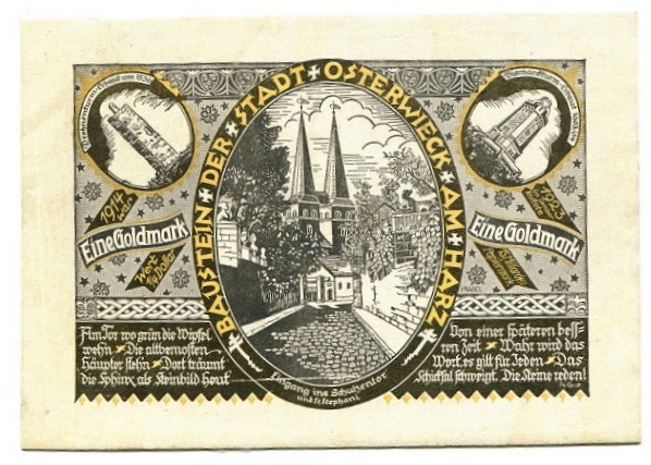 City of Osterwieck, Germany 1 Gold Mark Suede bank note dated 1923. This may have been a fund raiser because the note claims to be equal to 50 building stones. Very unusual note 137 x 96 mm in size. Cataloged as Grabowski 364 at $75. This note is in EF condition. $50.00 post paid to any US address. Check or money order payment only. No foreign address' please. Thanks , Fred