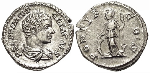 This is when Roman history starts to get confusing and chaotic. Unfortunately, the third century is one of the most poorly documented periods in Roman history. Within twenty years, we lose the century's best historian (Cassius Dio AD 229). The changing and evolving portraiture is amazing: RS26849. Silver denarius, references: RIC IV 34b; condition: gVF, mint: Rome, weight: 3.308g, maximum diameter: 18.4mm, die axis: 0o, date struck: 203 - 208 A.D.; obverse P SEPTIMIVS GETA CAES, bare-headed and draped bust right, from behind; reverse PONTIF COS, Minerva standing left, resting right on shield, spear in left. ex-FORVMANCIENTCOINS guy