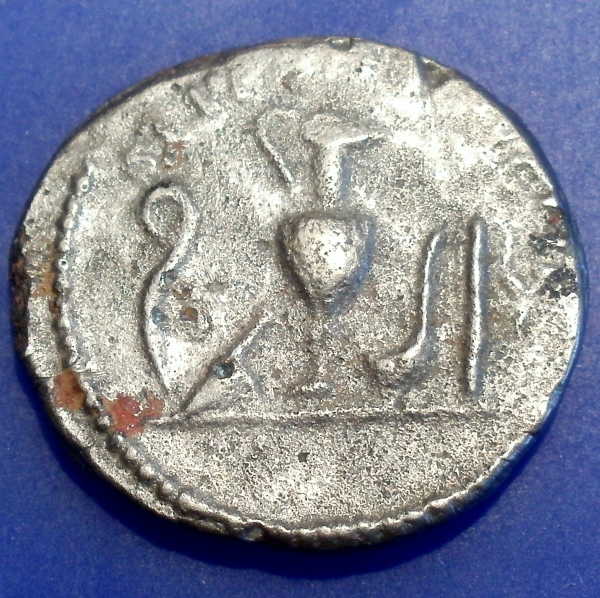 AR Denarius OBV: L SEPTIMIVS GETA CAES, draped bust right REV: SEVERI PII AVG FIL, priestly implements: lituus, knife, jug, simpulum, & sprinkler Struck at Rome, 198-200 AD 2.7g, 17mm RIC 3, C 188