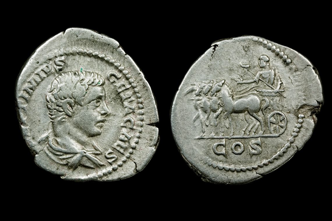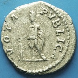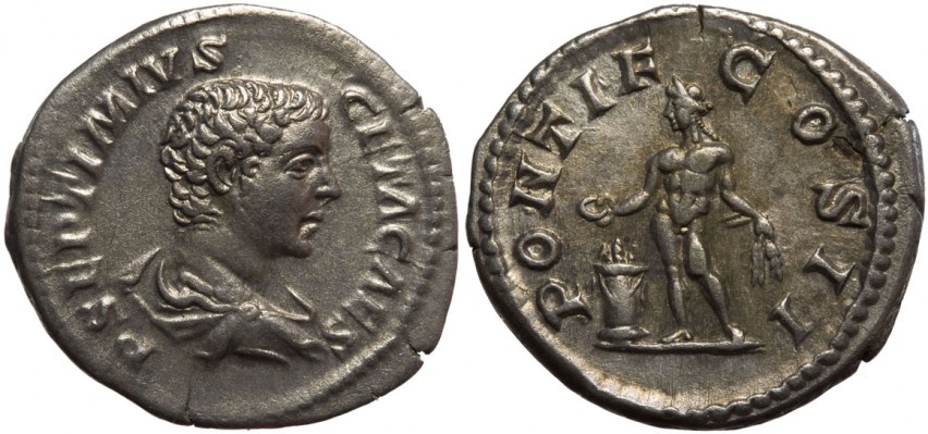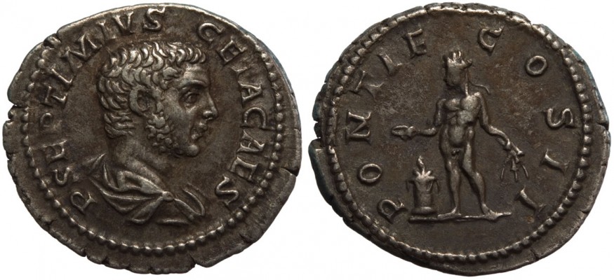 AR Denarius OBV: GETA CAES PONT COS, draped bust right REV: VOTA PVBLICA, Geta standing left, sacrificing out of patera over tripod & holding roll Struck at Rome, 205 AD 3.18g, 18mm RIC IV 38b