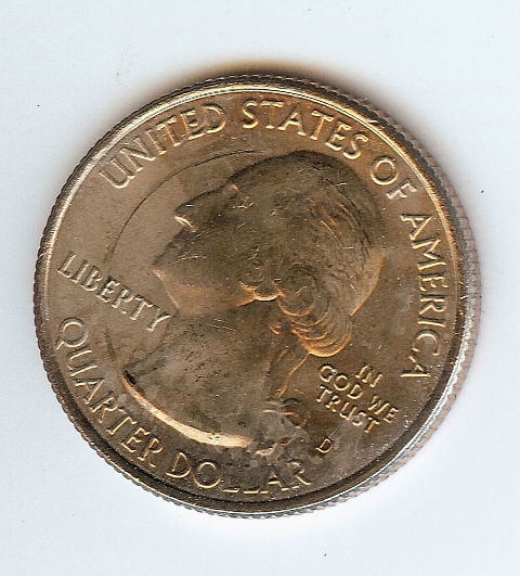 I found this quarter on the end of a newly wrapped roll. It has some bad rolling machine damage but I would like to know why it has such mottled coloring. To me, the non silver color is bronze or golden and the silver areas are very dull. Both sides have similar color mixing as the scans below show.