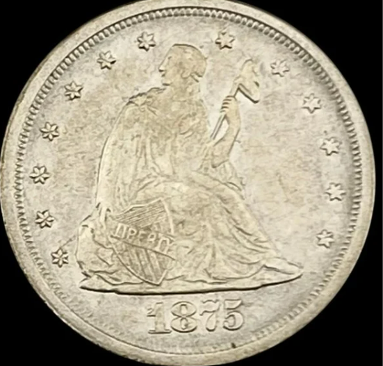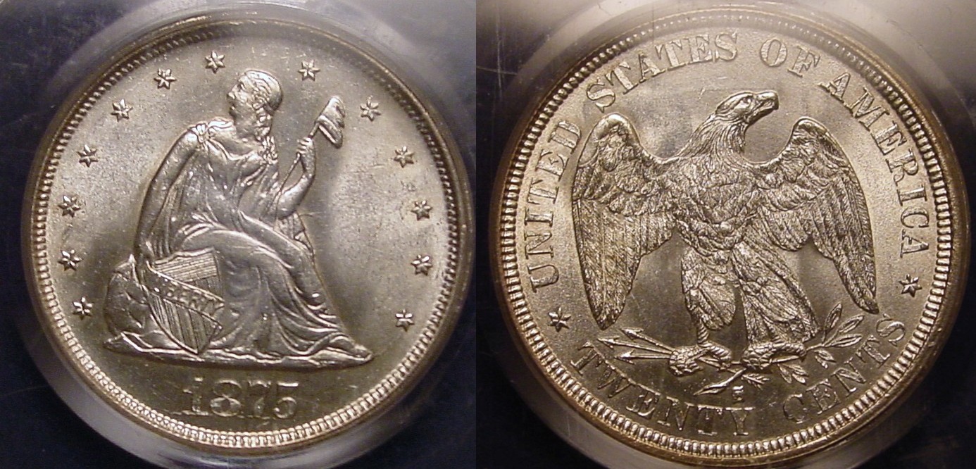 The only thing I can tell you about this is that the photos are very overexposed and slightly out of focus which can hide many problems. When it comes to Internet bidding, I stick with the dealers I know. I don't get caught up with outfits about whom I know nothing. I have bought a few items for under $100 from foreign dealers via MA Shops, but that has been about it. Here is a "white" 1875-S Twenty Cent piece. This one is graded MS-63. It's in an old PCGS holder.