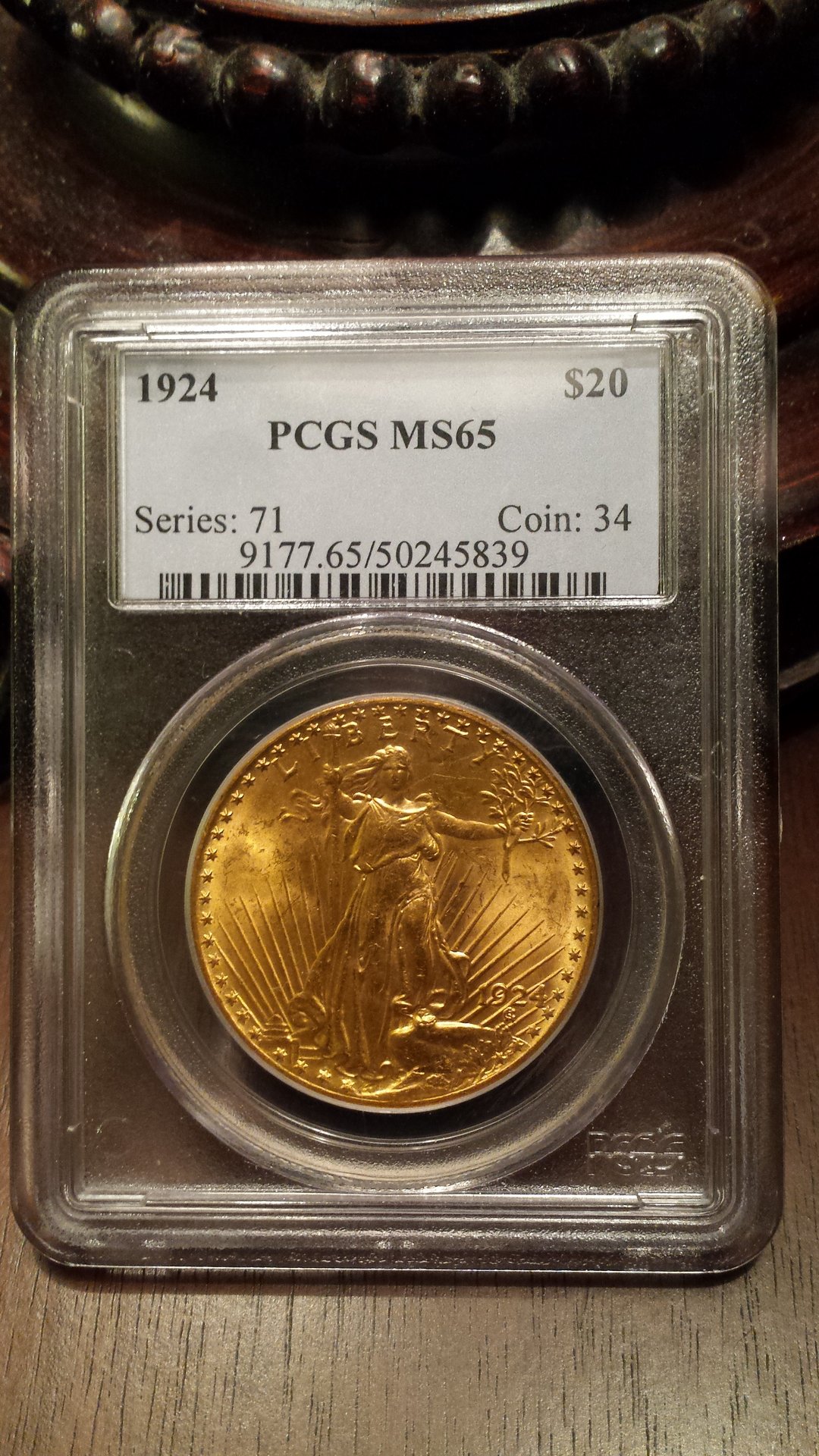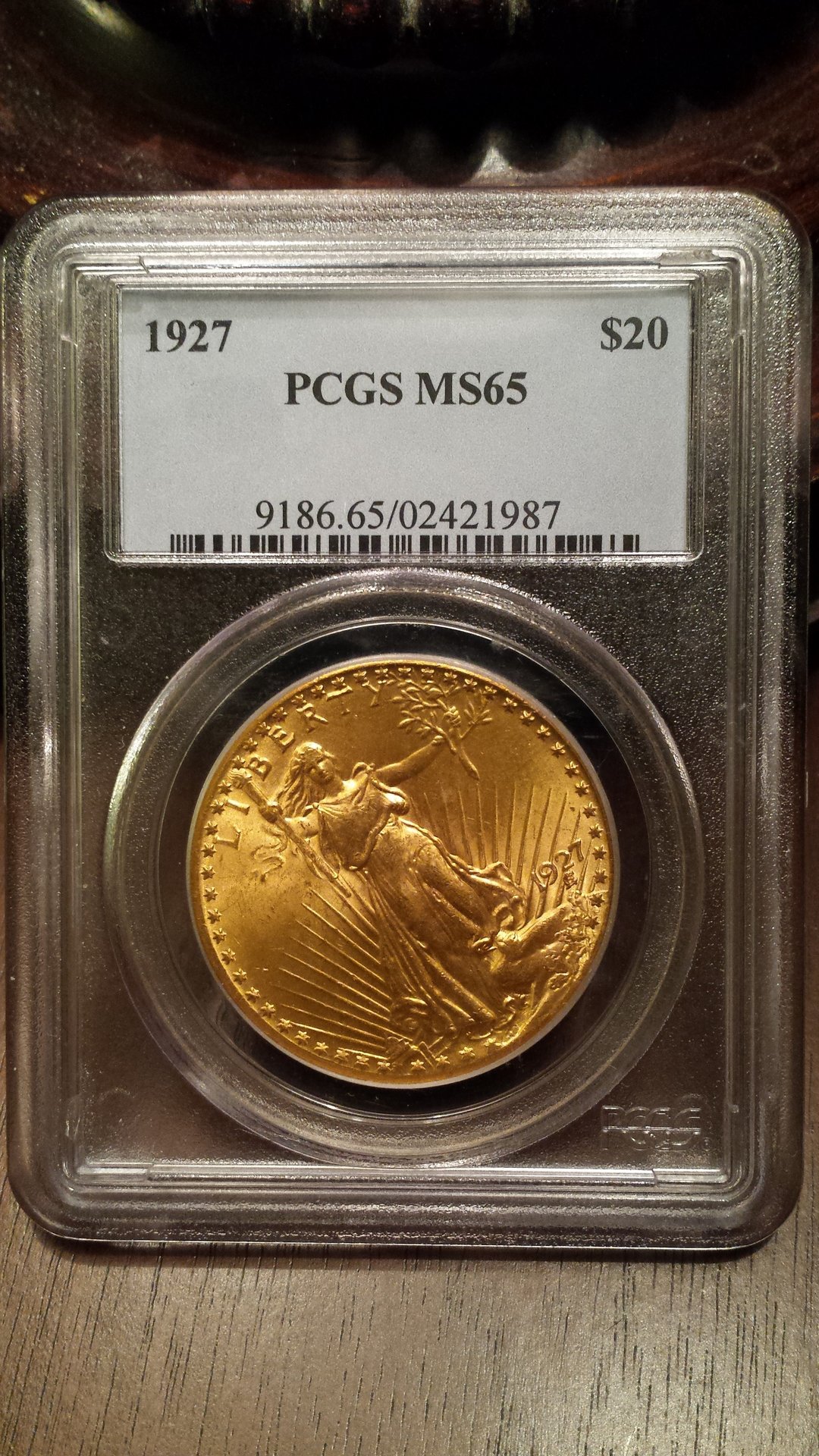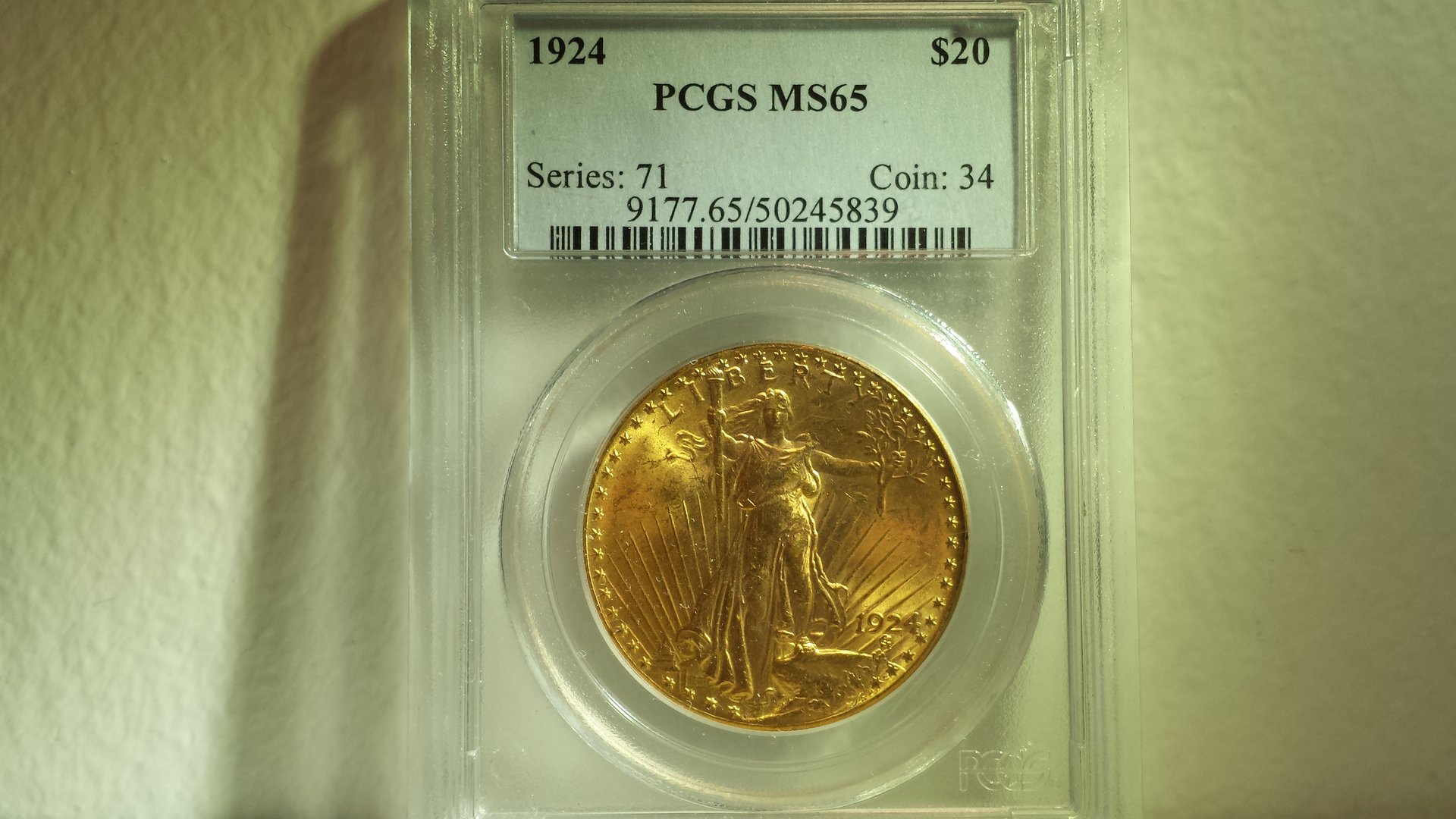 Some of my gold coins I've acquired throughout the years. I'll start off with my classics and add moderns that I've acquired over time. Here's my 1st classic, an MS-65 1924 Saint-Gaudens. Has good luster, I think the coin is properly graded. I took the pics with 2 different lighting conditions, the 2nd set is with lamp lights overhead. A bit better ? Taking coin pics is tough, I know next-to-nothing about cameras.
