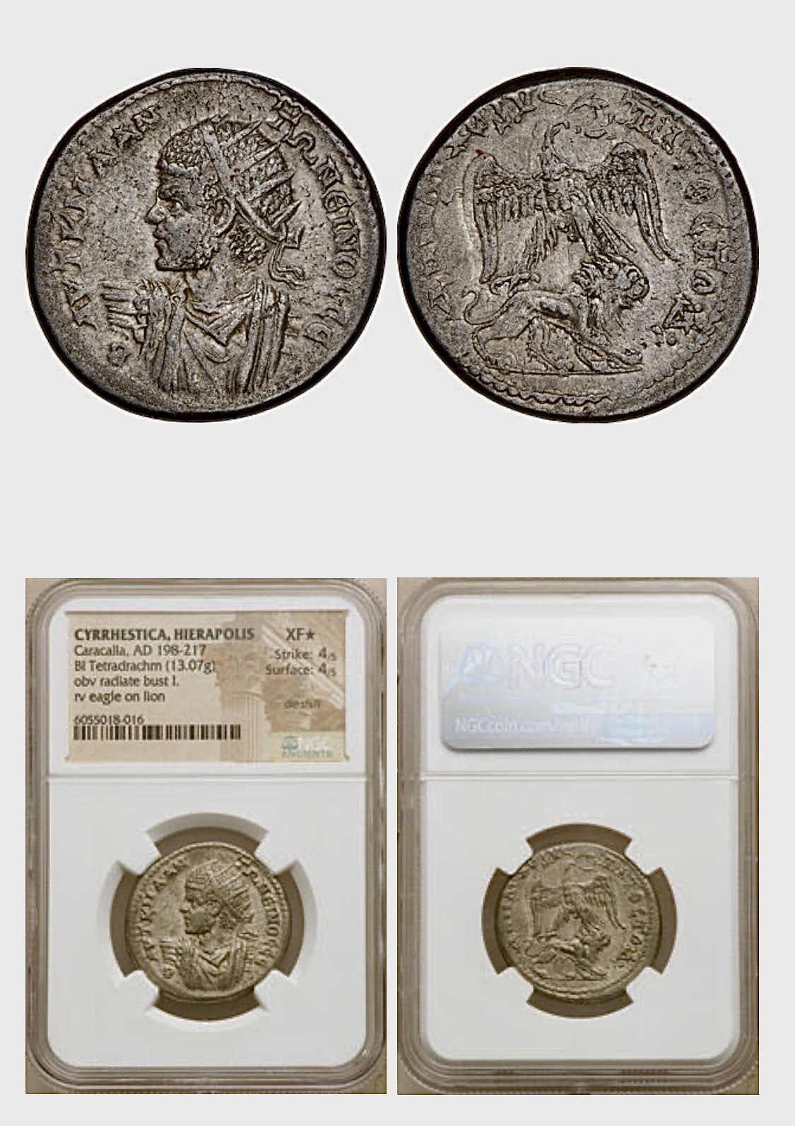Hello Everyone, Finally got lucky at Heritage today, tagging @Al Kowsky - I am confident he will appreciate this coin... Below description and image are from Heritage. Please post your most recent wins (last 3 weeks) Thank you!! Prieur Plate Coin CYRRHESTICA. Hierapolis. Caracalla (AD 198-217). BI tetradrachm (27mm, 13.07 gm, 12h). NGC XF★ 4/5 - 4/5, die shift. AD 215-217. AVT•Κ•M•A•ΑΝ-ΤΩΝЄΙΝΟC CЄ-B•, radiate, draped and cuirassed half-length bust of Caracalla left, seen from front / ΔΗΜΑΡ•X ЄΞ•Υ-ΠΑΤΟC TO•Δ•, eagle standing facing, head and tail right, wreath in beak, wings spread; on top of lion advancing right. Prieur 941 (this coin)