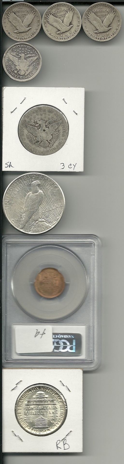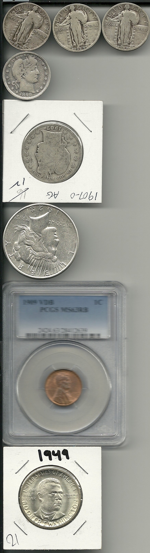 Ok guys I want to see how I did! As you know (maybe) im relatively new to collecting and this is only my 2nd coin show. First show was a disaster... I bought everything in my sight lol. This one was more organized and I made a list... but didn't use it that much. I tried but then I was like OOOOO and AHHHHH and yea it fell apart so I wanted to know basically, did I lose money on anything pay to much for something, get a steal on something etc. Alright lets go from top down 2 1929 standing liberty quarters (D) and 1 1929 SLQ (P)- $15 Just a side note this lady was so nice, she was in business since 1954 and was like 90 something. She was so interested in young collectors. She took 33 percent off the price of these. She let me hold a coin she was selling fro 160000 dollars. It was an experimental half dime made out of Martha Washington's silverware. 1 BEAUTIFUL SHINY SEXY 1899 barber quarter- 4.50 Literally I couldn't keep my jaw up. It was in a pile of garbage quarters and I was like oh ill just take this hehehe. 1907 O half dollar- 12 dollars not to proud of this one... it was 25% off and I didn't have a barber half dollar (I was in a barber mood today idk why) so I took it... maybe a bad decision 1923 Peace dollar- $23 The guy had a bunch of garbage peace dollars in a bin and I was initially turned off by it (idk why I wasn't turned off by that barber...) but then he gets this home depot bucket filled with peace dollars and this shiny one comes out right on top.. I had to have it 1909 VBD MS 63- $20 Originally I wasn't going to get one that was graded (this was like the only one on my list) but it was 5 bucks difference from a 40 (non graded) to a MS 63 so I was like hmmmm. give me give me give me!!! 1949 Booker T Washington Half- $21 I couldn't find any booker t's anywhere I looked then I see this guy setting up and he has these binder like things except they weren't in a binder... like just the pages. He was putting them into a case and a booker t caught my eye. I instantaiously and quite loudly lol said wait and got my booker t yay. 1960 Proof Set- 20 I couldn't scan this so sorry. This was the last item purchased because I loved it so much. I've always wanted a silver proof set and this one was cool. The nickel in it is toned gold and it looks really nice. Half dollar looks amazing! Also another thing I got was well let me tell you the back story. Im looking around and my moms says ill be right back going to the bathroom. So I continue to shop and then she comes back and has this heavy bag in her hand. Apparently the witman people were giving it away I think only to kids. It contained 1 of each denomination tube for coins 1- make your own mint set (you know what it is) 1- westward movement nickel display case thing 1- State quarter 1999-2001 cardboard display 1- State quarter P and D plastic holder 1- National Park Quarter P and D plastic holder 1- "The Expert's Guide Collecting & Investing In Rare Coins" I had fun and I hope you guys did too! Thanks, Jason PS- I was pretty pissed when I saw a girl flirt with this guy at the entrance and get early bird for free.. if only I was a sexy lady lol