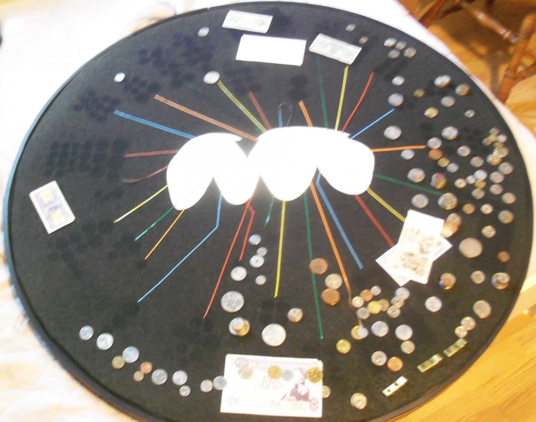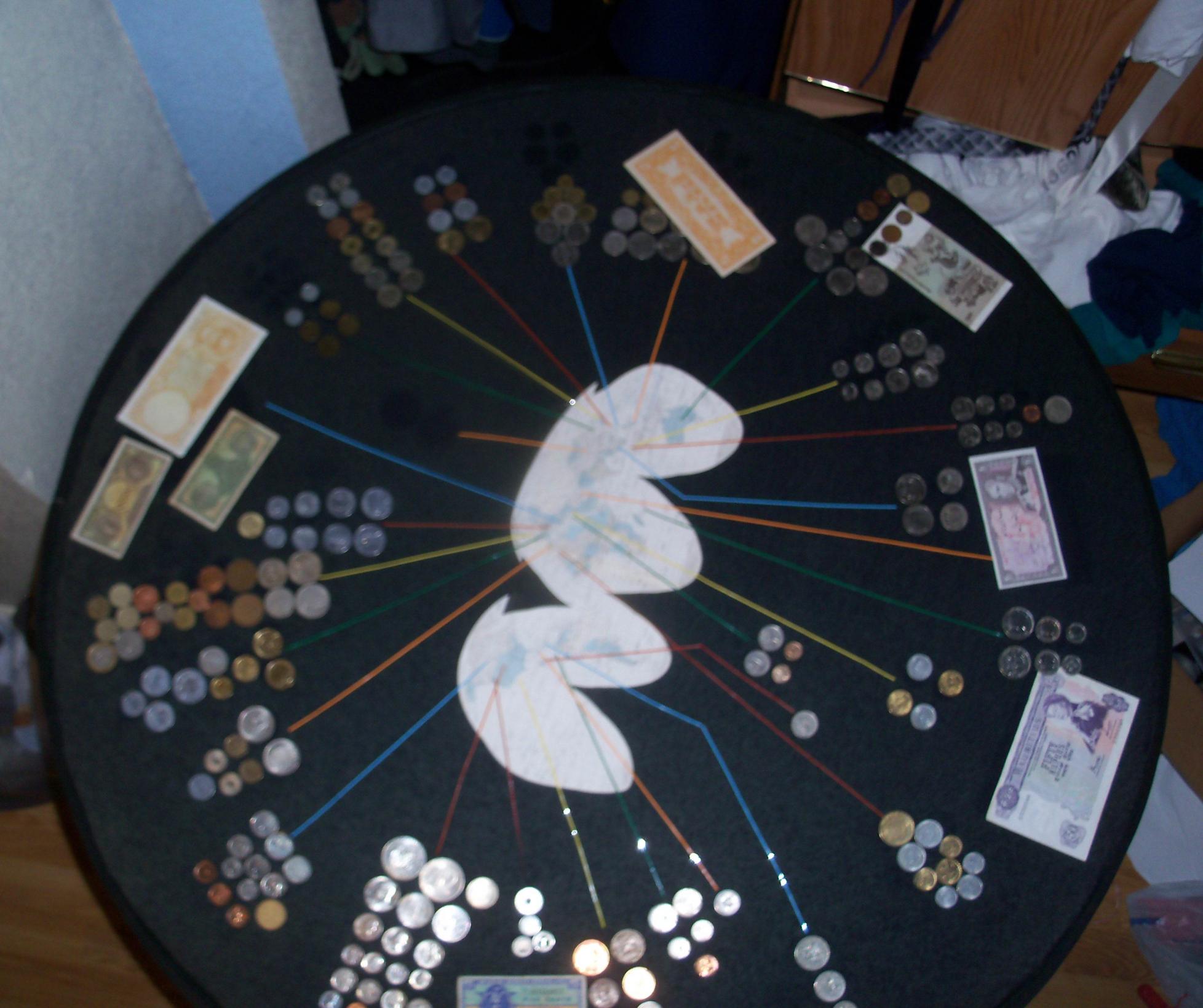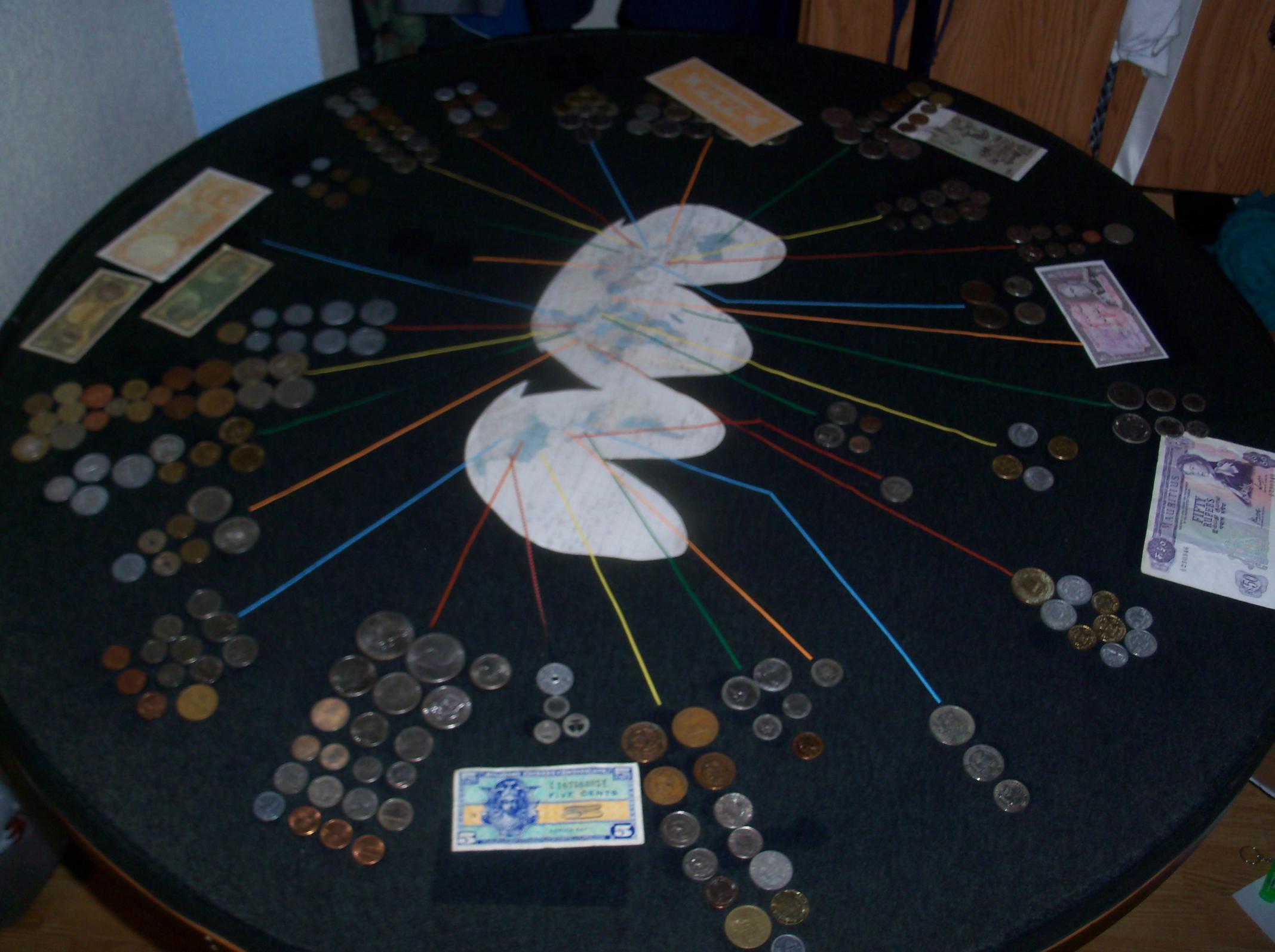 Now you just need a toilet seat to match... You say you rearranged them, so how were the coins attached to the table? Some kind of glue or tape? How about the notes? Could you list all the countries represented or even what all the denominations of coins and notes are? That table is indeed a sweet gift from a very thoughtful aunt! Thanks for sharing.