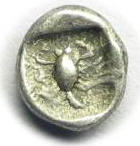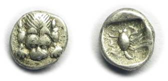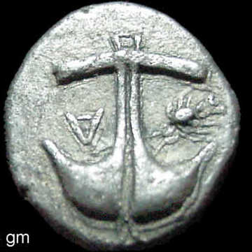 REV: An anchor flanked by letter A and a crayfish, which represents the minting city of Apollonia, the major fifth century BC Greek colony on the west coast of the Black Sea, modern Sozopol in Bulgaria