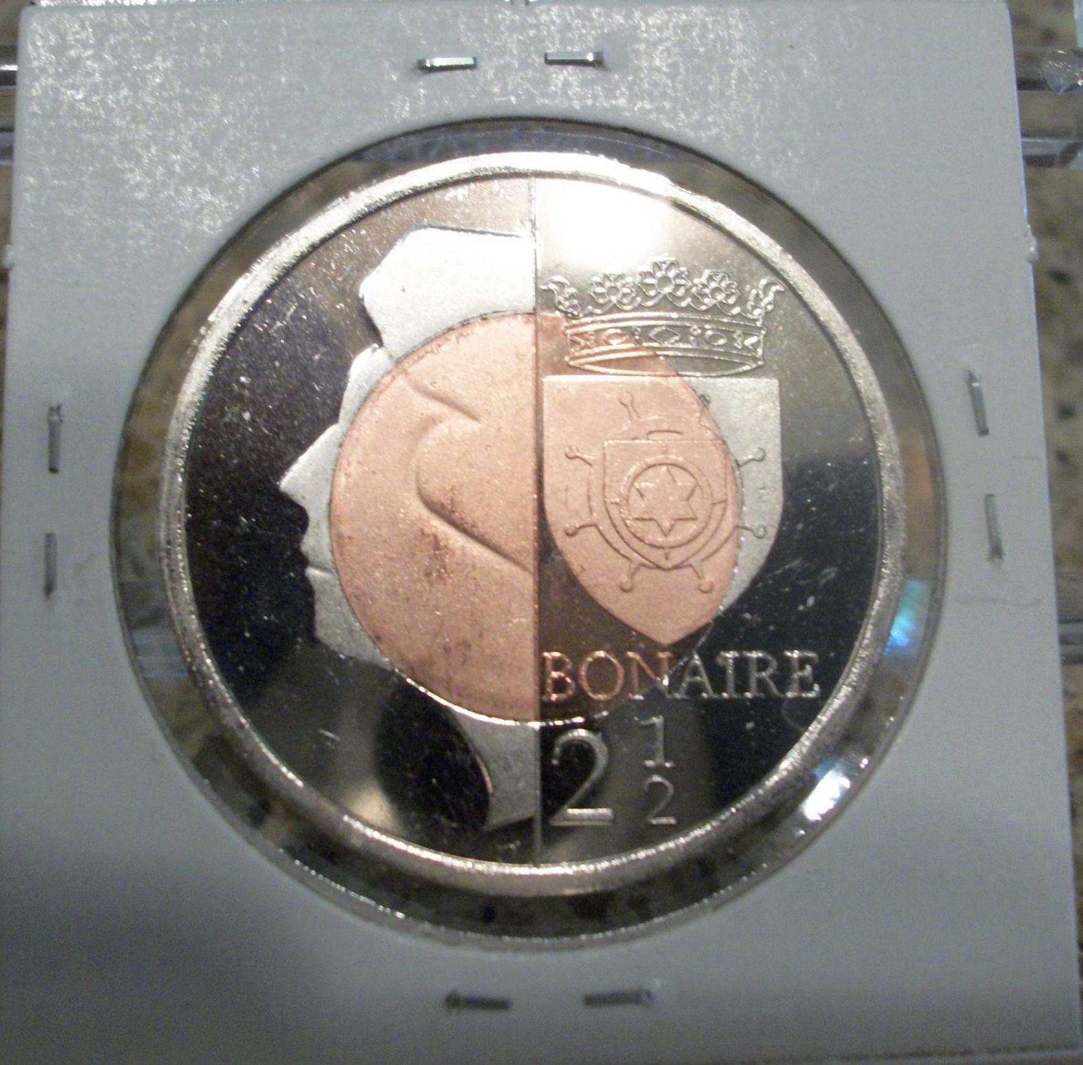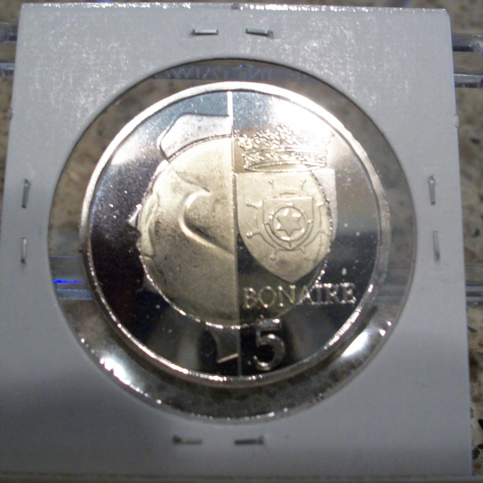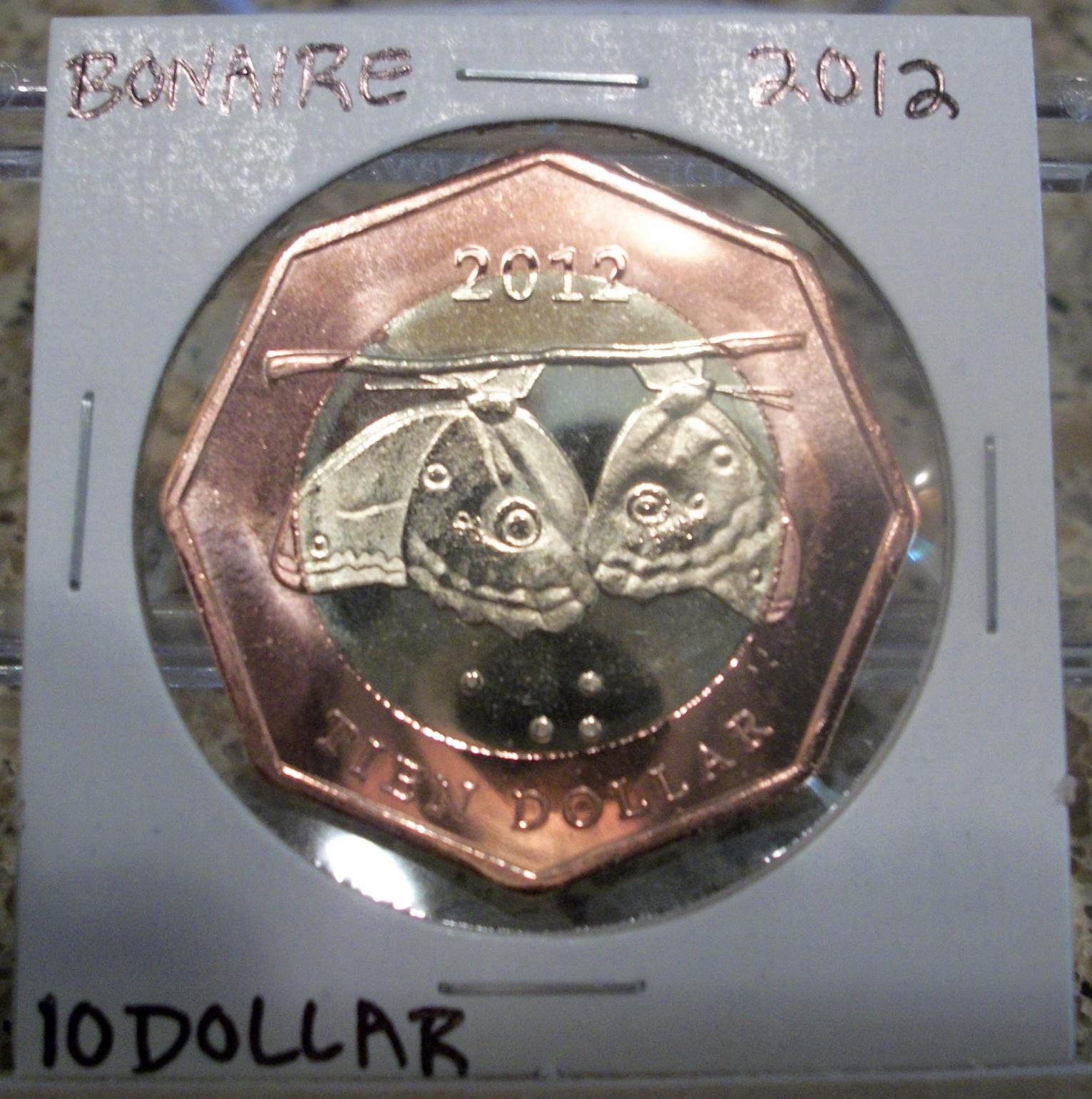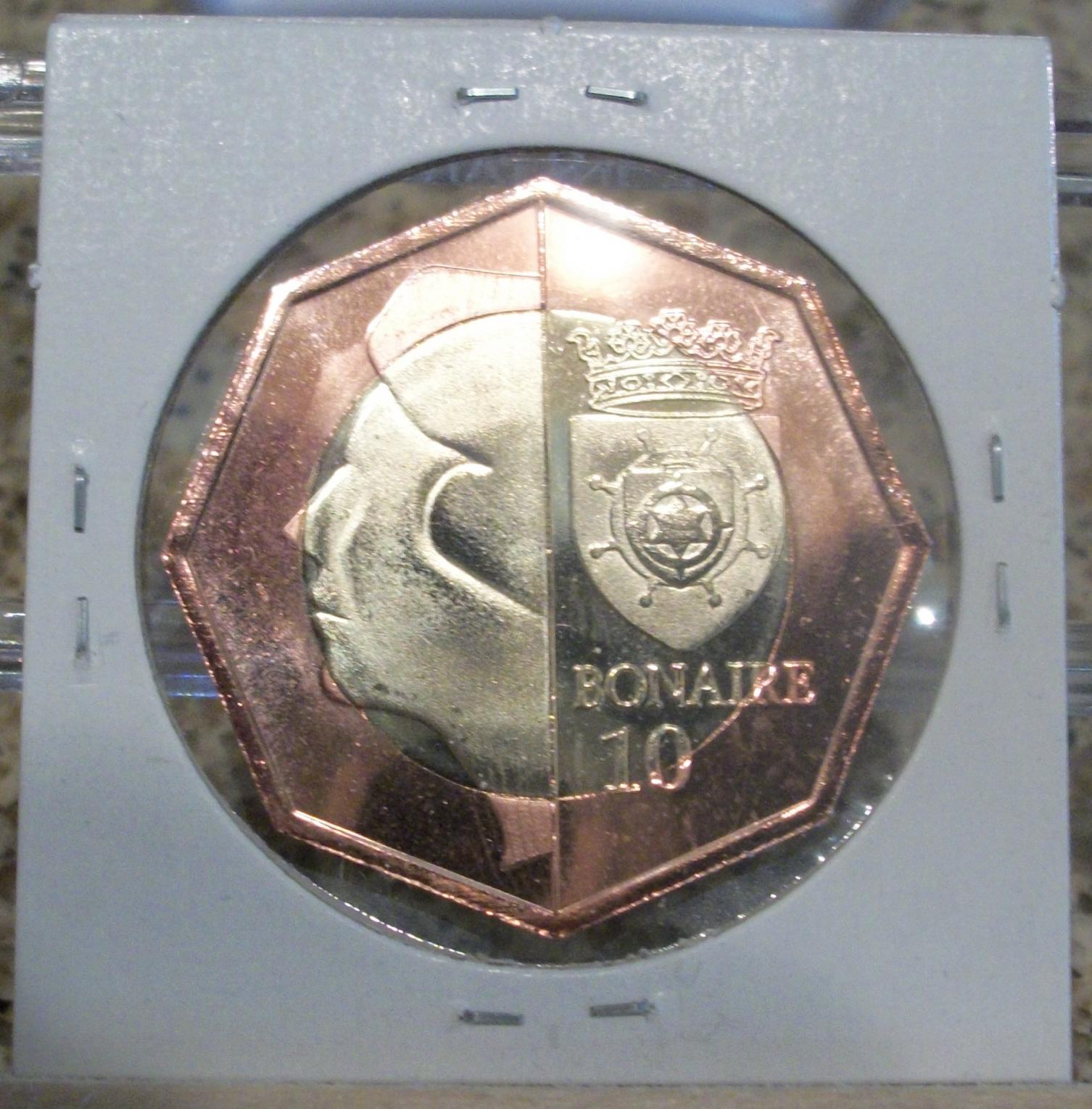 Bonaire 10 Dollars this coin is my personal favorite from this set. the color is simply amazing. the weight of this is quite hefty. its 8 sides are fun to hold. I need to get an airtite for it. I do not want to see it scratched up. this set went from smallest to largest size and not by denomination order. I am liking bi-metallic coins more and more.