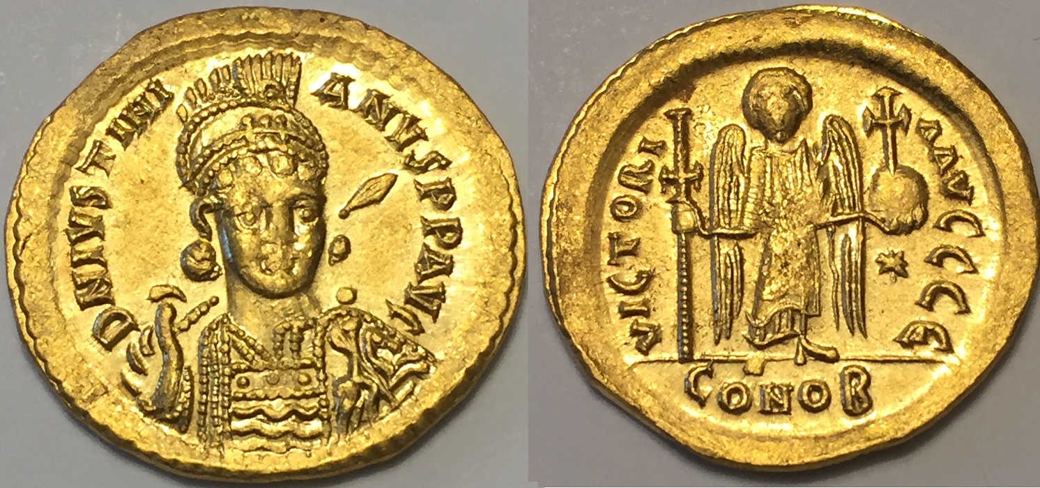 Nice, I am still stuck with only 1 solidus Justinian --- Emperor 527-565 Struck 527-538 AD at the 5th Officina of Constantinople. Obverse: DNIVSTINI ANVSPPAVG Short ForD(ominus) N(oster) Justinianus P(er)P(ertus) AVG(ustus) Translates to:"Our Lord Justinian, Eternal Augustus" Helmeted and cuirassed bust facing slightly right, holding spear over shoulder and shield decorated with soldier on horseback riding right Reverse: VICTORIA AVGGG E; ("To the Victory of the Emperors") Angel standing facing, holding long cross and globus cruciger; star to right; CONOB ( Constantinople, 1/72 pound pure gold ) References: Sear 137. DOC 3 (e). MIBE 5. 4.51g 21 mm