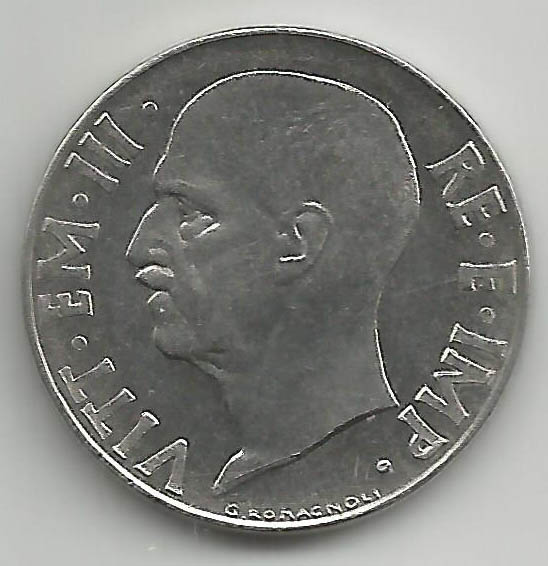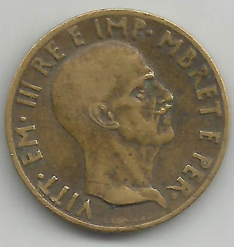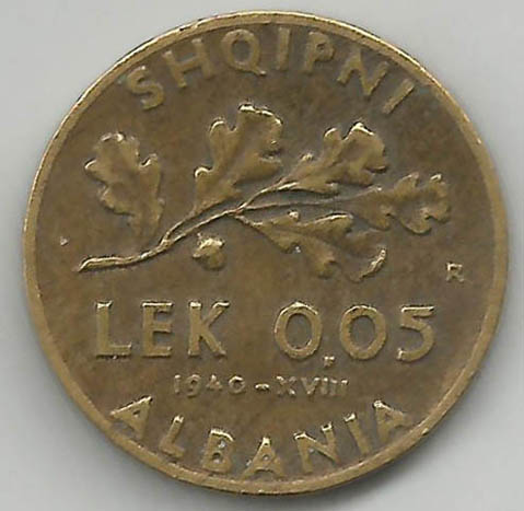 0.05 Lek 1940, bronzital (an alloy with 82% copper, 16% aluminium and 2% nickel)