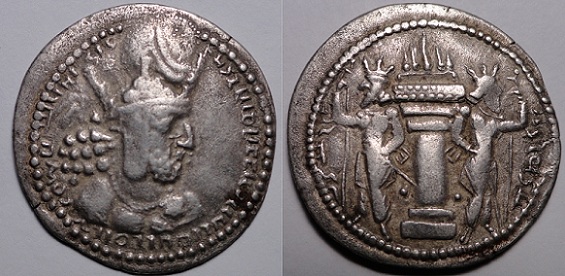Obv. Bust if Shapur I with Helmet with ear flaps. In the name of the Great Mazda Worshiper.