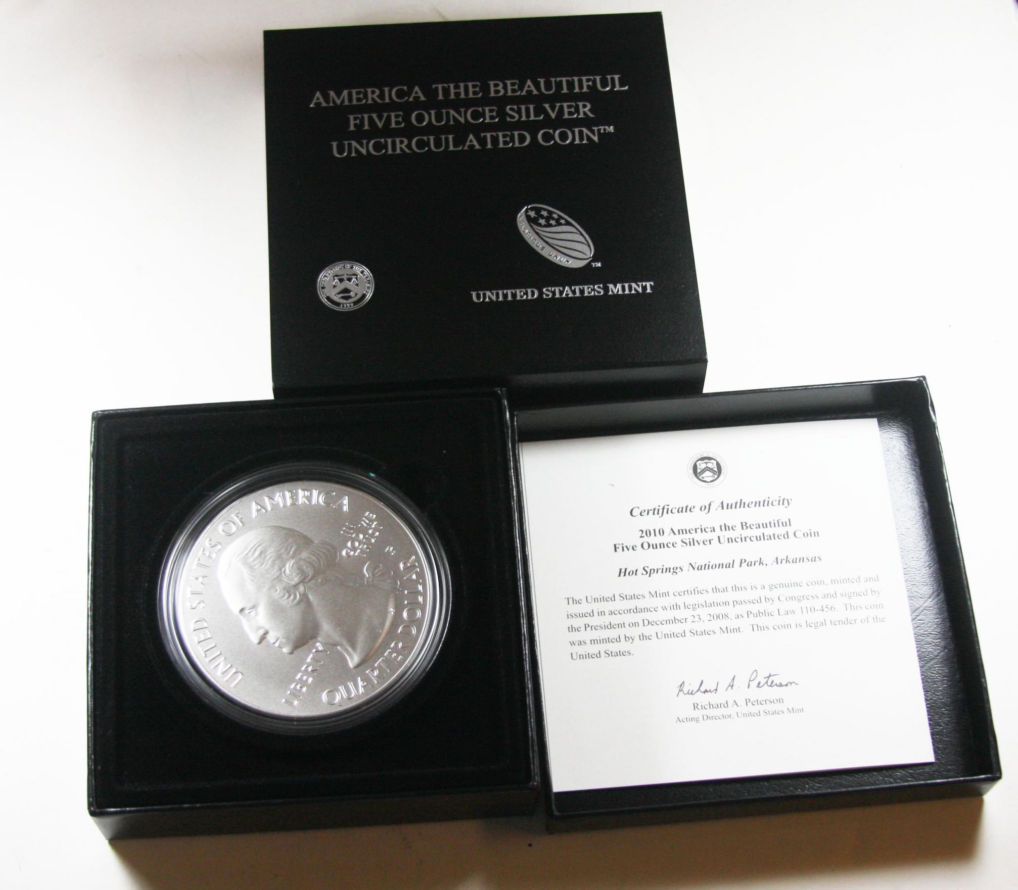 For those of you who listen to the podcast. (My sig line and/or the player to the right side of the site.) You will know that I loathe the 5oz hockey pucks... or at least I did till I got my hands on one. You know these really are pretty nifty coins. The thing about them that draws me to them is NOT the design... but the size. As someone who has studied US coins the majority of my life I really like these coins because they are the BIGGEST coins ever made at the US mint. I also noted that the signature of the ACTING mint director was included on the paperwork. I got my Hot springs in the box today and I wanted to share a few pics. Enjoy!