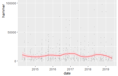I'm a bit late to the party, but have done some research in price development. Using data from sixbid for a few popular types (Caesar elephant denarius, Athens tetdrachm, and a few others), I tried to model a relation between predictors (e.g. estimate, grade, damage, slabbed vs unslabbed, etc.) and actual hammer price. I encountered various problems: 1) data is unstructured 2) sufficient amount of data is difficult to achieve (i.e. sixbid works by scrolling down. In order to obtain >1000 datapoints, I installed an auto-scroller, which takes quite some time) Still, it's enjoyable. To overcome problem nr. 1, I programmed a text-mining algorithm to obtain information on grade (grouped in four groups, ranging from fine to mint-state) slabbed vs unslabbed toned vs untoned damage (cracks, graffiti, cleaning marks, scrapes, etc.) banker marks off-center other notions (luster, brilliance, etc) This topic is 1) on the price trend of high-end coins over time and 2) whether finding a (large) hoard influences the prices. These questions could of course be answered, but problem nr. 2 will probably make it a bit more difficult. Just for fun and giggles, I will try to demonstrate one example: the Julius Caesar elephant denarius. Going back until 2012, I extracted 837 auction results: As this topic is on high-end coins, I decided to take only the extremely fine and mint-state coins (n=391), remove the damaged, bankermarked, and off-centred coins, leaving a total of 318 coins with a substantially higher mean hammer price of €1177. Then, plotting the hammer price over time results in the following graph: which is fairly constant over time. So, yeah, this is still a n=1 study. However, the script I've coded is fairly accurate (it's coded in R) and could easily be extended to other coin types (at this moment, I'm trying to answer question 2: is coin price affected by the finding of a hoard? using data of the Athens tetradracm). The most tedious part however is scraping obtaining data from Sixbid or other sites. So if anyone is interested enough, and would like information on a certain coin type, please pm me for more details