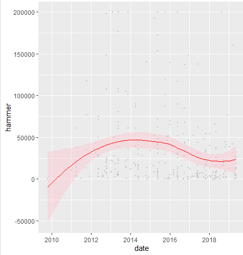 The table suggests that Octavian aurei lost half their value from 2014 to 2018. That does not seem stable. Certainly at least one of the n=318 sold twice from 2011 to 2019. If so, can someone add a line or color to link them up? I am curious about individual examples. @Suarez Do you think the 1990s data is unbiased? It is much easier to collect data now. Your site coryssa.org is a great resource. For the 1990s data do you think you have a representative sample? Have you encoded middle-level auctions like Alex G Malloy? Everyone: Typically when a coin type sells for a high price, for example Octavian aurei in 2014 according to the chart, everyone tries to sell their examples at the top of the market. I would predict that would cause prices to decrease, which is what we see here. Do we see the volume of an individual type change in response to last year's prices?