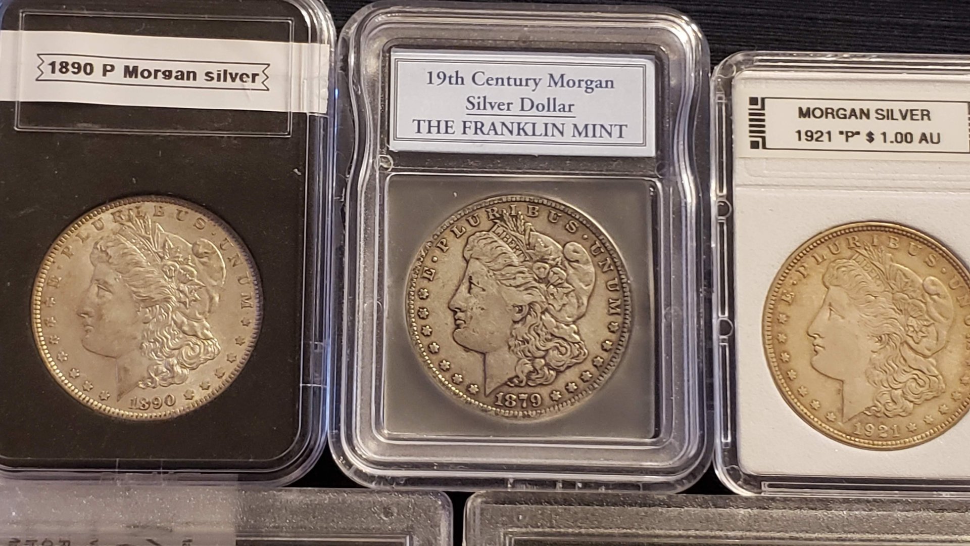 WOW I hope you guys are at work the day I send MY Morgan's in to have them graded! Woah I mean, how can a coin look so bad with having no sign of being in circulation at all. There is no wear in her hair in the obvious spots. The cotton leaves and flowers show no signs. Even on the Reverse, the Eagles breast is pristine as ever and the finer feathers on the Eagle's neck, head and even between his legs look just like it would have the day it came out of the mint. But what the hell kind of toning is that? It looks like it stayed away from her head. Like there is an outline encompassing the edges of her hair and face. It is darker on the Reverse but both sides look like an old house that has the paint chipping off. I'm sorry but it's not an appealing coin. It could have problems , but if it was a visually appealing coin I'd give it an ms64, but with all the marks on her face and not even having 1 sq inch clear in the field I couldnt go any higher than AU58. Here are just 3 of mine and I'd feel SO good about sending any one of these in.