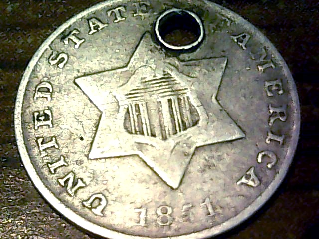 First year issue 1851 Im guessing the grade as fine. this guess comes from a picture grade guide. So id like your opinion and also the value with it being holed it was pretty much free and my first 3 cent piece the date isent as bad as it looks in the picture