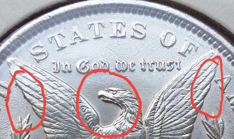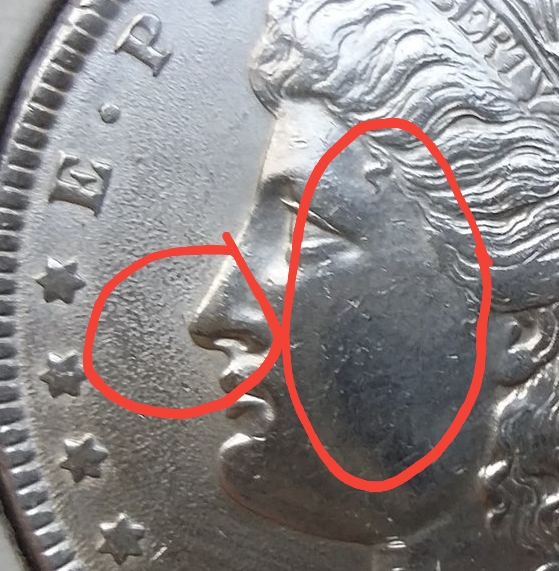 In the obverse, look at the cheek and face first. See how the original skin and luster is completely removed? It almost looks like a clay sculpture... tiny imperfections... as in the bag marks blending right into the surfaces. Then look in front of the face. Surrounding the design, stars, and letters, you'll see a halo of glow, indicative of some sort of cleaning. But polishing can be seen in the hundreds of tiny divots in the surfaces, where metal was moved... made to appear somewhat like original flow lines or luster. But compare to another coin and you'll see the difference. Your coin has been stripped of all originality. The same can be seen on the reverse. Look at the circled areas.