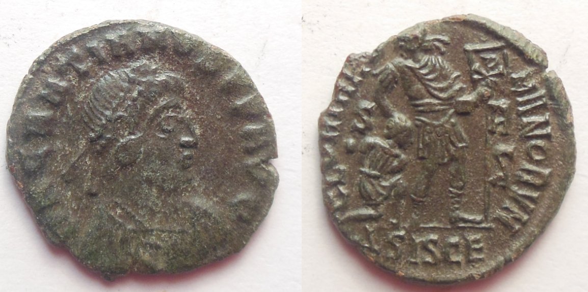 Gratian AE3. 367-383 AD, Siscia mint, 2.3g, 18mm OBV: DN GRATIANVS PF AVG, Pearl-diademed draped & cuirassed bust right. REV: GLORIA RO-MANORVM, Emperor walking right, head turned back, holding labarum and dragging bound captive behind him. S over dot in left field; A over sigma in right field; Delta SISCE in ex. REF: RIC IX Siscia 14v This coin is a recent purchase along with some of the other late Romans. The number of workshop marks for this coin just staggers the mind. There are it seems like hundreds of them. Perhaps this one might be unlisted but most of them seem to be lumped into RIC IX Siscia 14, so I'm stating the catalog as that unless someone disagrees or finds a exact match for this coin. Wikipedia copy and paste history.