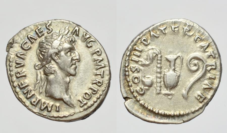 Lovely coins!...I only have 1 Denarius of him which took a year of being overbid on to acquire.....Wanted a Nerva to complete my 5 good emperors set and on a tight budget of less than $90 was always going to be a difficult ruler to find....This one came along and really appealed to me especially the nose! ..... Nerva AR Denarius. Rome, AD 97. Obverse..IMP NERVA CAES AVG P M TR POT, laureate head right Reverse..COS III PATER PATRIAE, Priestly emblems: simpulum, aspergillum, guttus, and lituus. RIC 24; RSC 48. 3.12g, 17mm, 6h. From a private Swiss collection.