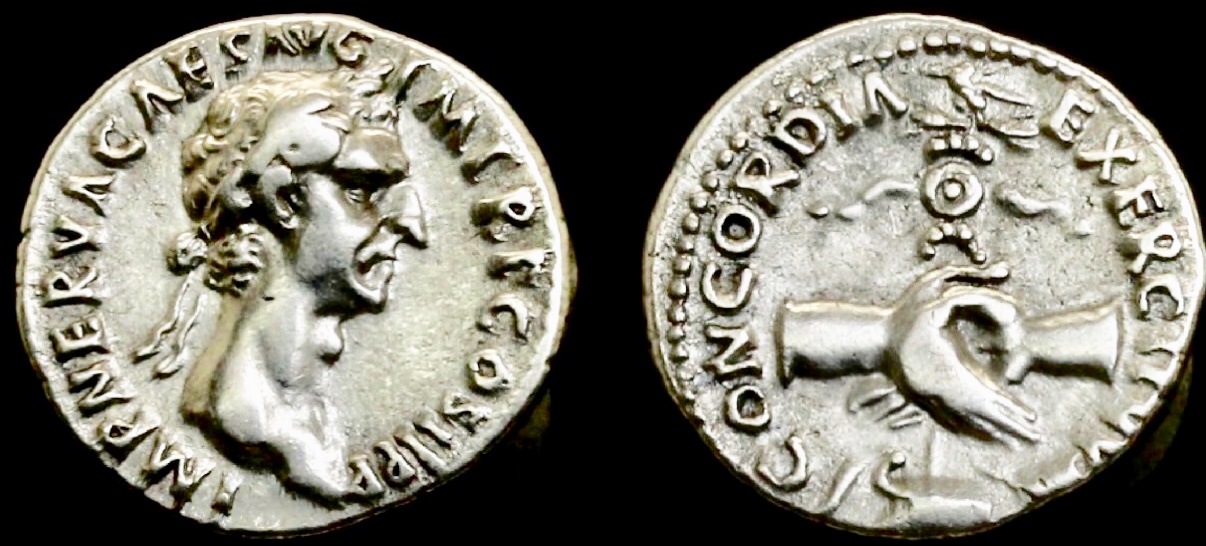 Excellent writeup, and a wonderful parade of proboscises! NERVA AR Denarius. 2.88g, 17.4mm. Rome mint, AD 97. RIC 14; Cohen 20. O: IMP NERVA CAES AVG P M TR P COS III P P, laureate head right. R: CONCORDIA EXERCITVVM, clasped hands. Ex Ratto Sale, 19 January 1956, lot 366 NERVA AR Didrachm. 6.69g, 22.1mm. Metcalf 33; Sydenham 146. CAPPADOCIA, Caesaraea-Eusebia, AD 97 (3rd Consulship). O: AYTOKPAT NЄPOYAC KAICAP CЄBACTOC, laureate head right. R: YΠATOY TPITOY, Club placed vertically downwards. Ex stevex6 Collection