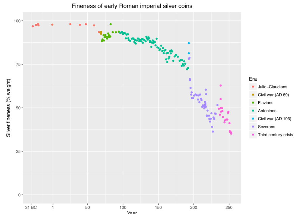 I really enjoy exploring these niches. Interesting how various coins, as a reflection of the economies, changed as times changed. A huge upheaval was the Denarius Reform of 211 BCE due to the effects of the War with Hannibal (2nd Punic War.) However, the Roman Republic was starting with a good coinage base with the Heavy Denarii series a 100 year span before, but changed due to a nasty war crisis. Another was the AE Coins changing under Augustus, and then we all know about the coin debasements under Caracalla (Double-Denarius), that later resulted in Fiat (Token monies). My interest dwindles after 500+ years use of the Denarius (approx 310 BCE with the first Heavy Denarius, through approx 212 CE with the intro of the Double-Denarius.) First Denarius RR Anon AR Heavy Denarius - Didrachm 310-300 BCE 7.3g 21mm Mars-Horse FIRST Cr 13-1 Left One of the Last "Denarii" (I know some were issued later) RI Caracalla 198-217 AR Denarius MONETA https://en.wikipedia.org/wiki/File:Fineness_of_early_Roman_Imperial_silver_coins.png