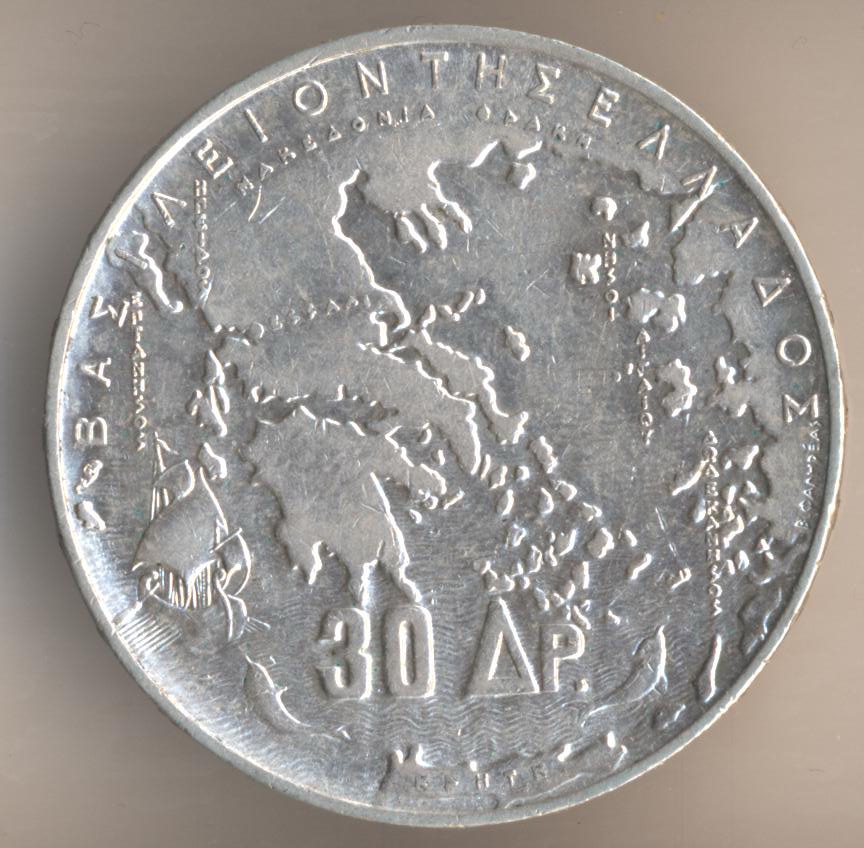 In 1963 Greece celebrated the Centennial of Royal Greek dynasty. 30 drachmai 1963, silver .835, weight - 18 g., mintage - 3000000.