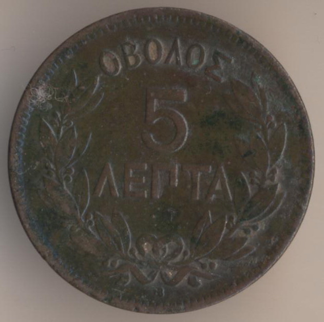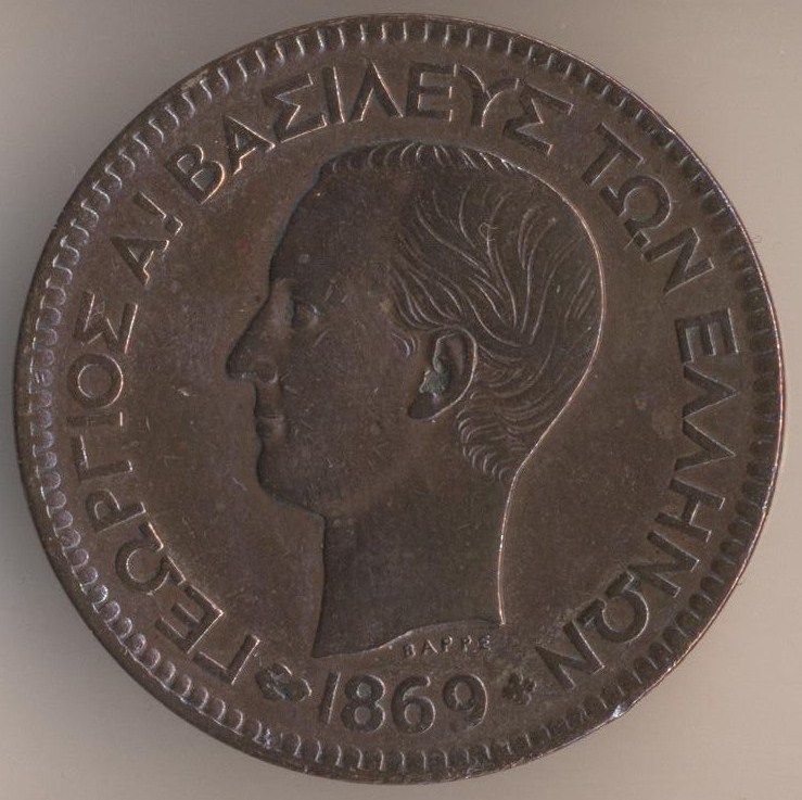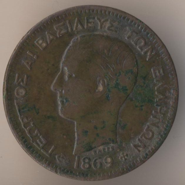 5 lepta 1869, copper, weight - 5 g., size - 25 mm, thickness - 1 mm, mintage - 23945000 pcs. Engraver: Albert Desire Barre. Strassburg Mint. Ruler: king George I (1863-1913). Coins of this type were released at 1869 and 1870 only.