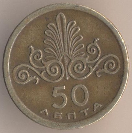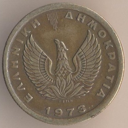 50 lepta 1973, nickel-brass, weight - 2,5 g., size - 18 mm, thickness - 1,4 mm, mintage - 19152000 pcs. Engraver: M. Perantinos. The single release only.