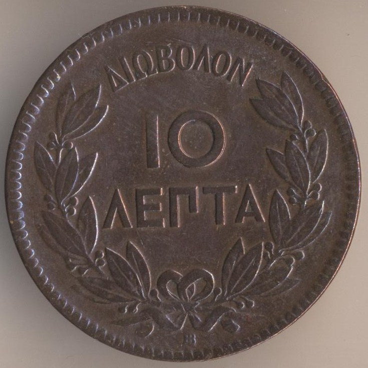 10 lepta 1869, copper, weight - 10 g., size - 30 mm, mintage - 14994000 pcs. Engraver: Albert Desire Barre. Strassburg Mint. Ruler: king George I (1863-1913). Coins of this type were released at 1869 and 1870 only.