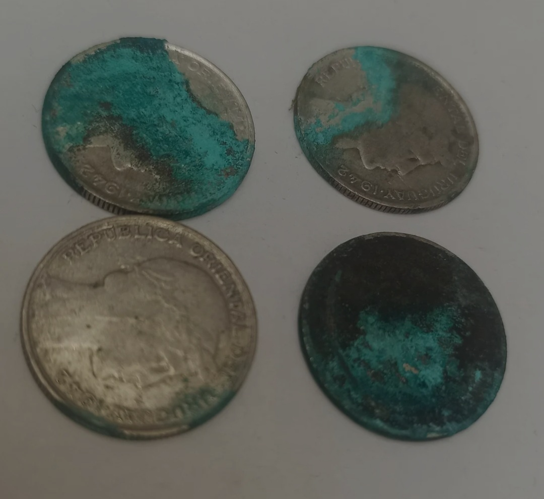 Gonners but at least their silver! I've never had success at conserving silver with heavy verdigris. I always had to resort to mineral acids which ruins any numismatic value. Normally, it's entrenched, permanently attached and headed to terminal stage. Be sure to keep the coins with verdigris isolated. Verdigris is transmittable! I found a perfect example roll searching. These 2 coins were stuck together and it took considerable force to separate them. Obviously, the corroded coin was put into the roll next to a mostly red coin. Overtime, verdigris spread and grew on the red coin.