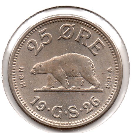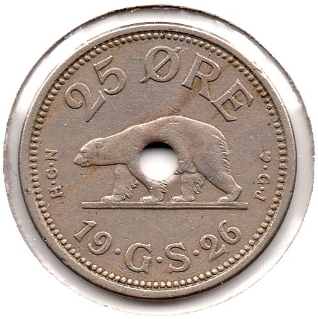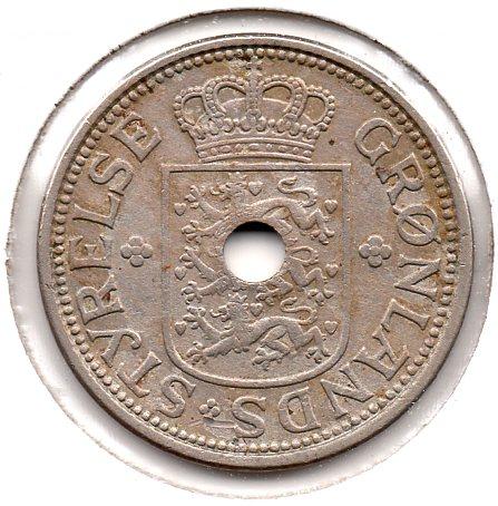 The 25 Øre of 1926 was sent to New York, USA in 1940 to be holed in order to distinguish it from the 1 Krone. Apparently there was some confusion between the two. Though the 25 Øre was made of Copper-Nickel and the 1 Krone was made of Aluminum-Bronze, the coins were of the same size and design. Also there is a higher percentage of copper in the 25 Øre and after a while it tends to turn a slightly yellowish colour, which in a quick transaction may be mistaken for the higher value or vise versa. Adding to this, a great percentage of the indigenious population of Greenland wasn't literate at the time. GreenLand - 25 Øre - 1926 HCN GJ - KM #5 - CN - Obv GreenLand - 1 Krone - 1926 HCN GJ - KM #8 - Al-Bronze GreenLand - 25 Øre - 1926 HCN GJ - KM #6 - CN - Holed