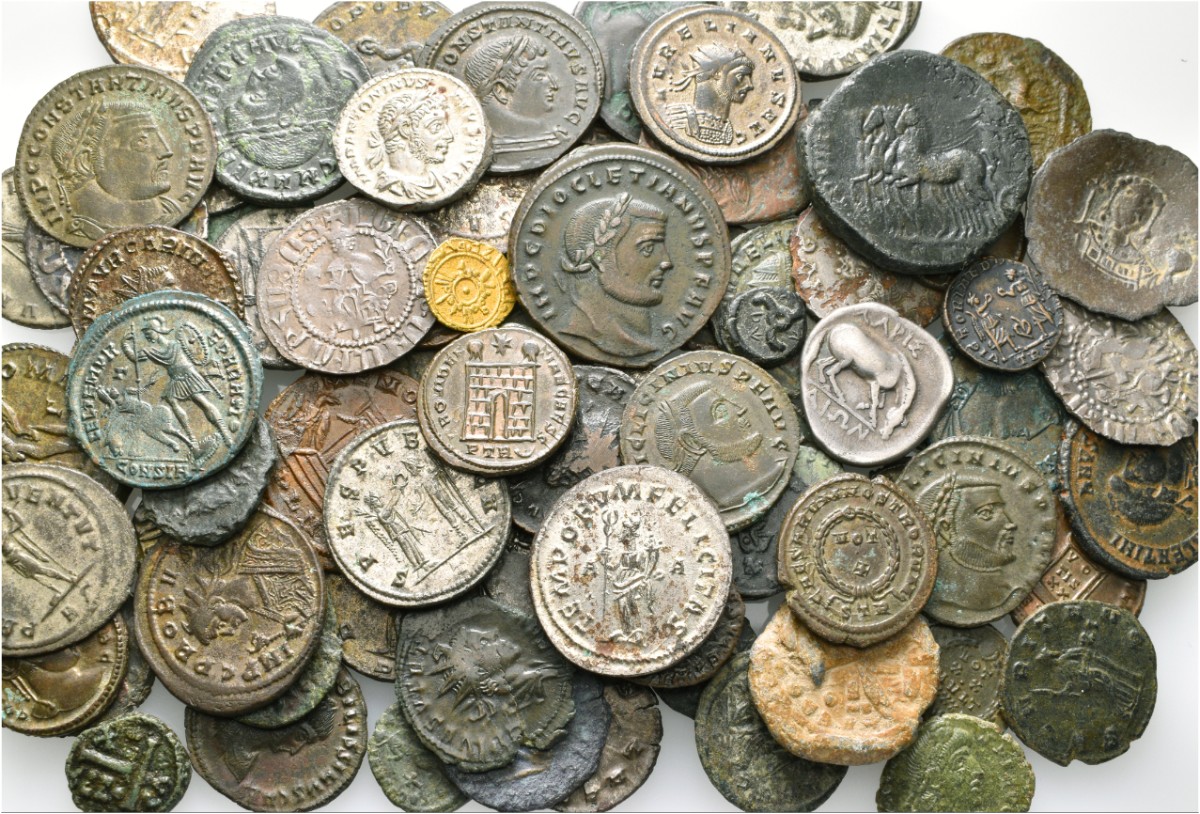 I think all of us enjoy going through a nice pile of unidentified ancient coins. (If you're like me, you even have occasional dreams of discovering a heap of coins hidden away in a drawer somewhere... very nice dreams, those!) I went after a big group lot recently in hopes of having this experience, and because the photo looked rather enticing: Looked like a nice variety! My thoughts went something like this: "The tiny gold Islamic piece and the Larissa drachm are surely worth quite a bit, no? and I don't have either! Hmm, what is that intriguing yellowish piece near the bottom right? Oooh, I like that Diocletian in the middle too. Sweet Aurelian portrait there, and a sestertius right next to it? what's that triskeles right next to the Diocletian, is that Lycian? Look, an FH to show Randy! ooh, I've been wanting one of those Armenian silvers, also a bearded Constantine..." etc. etc. No this wasn't @zumbly's amazing lot which included an Antony and an Otho denarius (!!), but still... definitely not run-of-the-mill! On the other hand, what was underneath the pile of neat looking stuff? a bunch of duds? The photo totally sucked me in, and I placed a bid at $16 U.S. per coin (including fees, exchange, & shipping)... and lo and behold, I won the lot! 83 coins in all. Awesome!! Wait, 83 COINS!?!?... HOLY YIKES AND A HALF, WHAT DID I JUST DO?!?! If you're curious to know how I made out (like a bandit? or sucked in, hook, line & sinker?), if you'd like to take a better look at some of the coins in the lot, see what invisible mysteries they hide underneath them, or just pretend you're digging through the pile yourself, this is the thread for it. I have now photographed almost all of the coins individually and will take requests. Describe where it is in the group photo and I'll show you the coin in all its glory, or all its shame. Meanwhile I'll also gradually post some of my favourites, plus some of the duds. (Yes, there WERE duds, but I won't yet say how many...) I'll do my best to keep up, but please forgive me if there are times when I'm incommunicado! You're also invited to post anything related to what you see in the group photo, and also as the hidden stuff comes up. (Which I suppose probably means post anything at all...?) ALSO... if you help me with one of the coins (ID, further info I didn't know, or any interesting tidbit) I'll put your name in a hat and do a draw. Winner gets one of the coins. (NOT a dud, I promise!) I hope this thread captures and passes on some of the fun I had!
