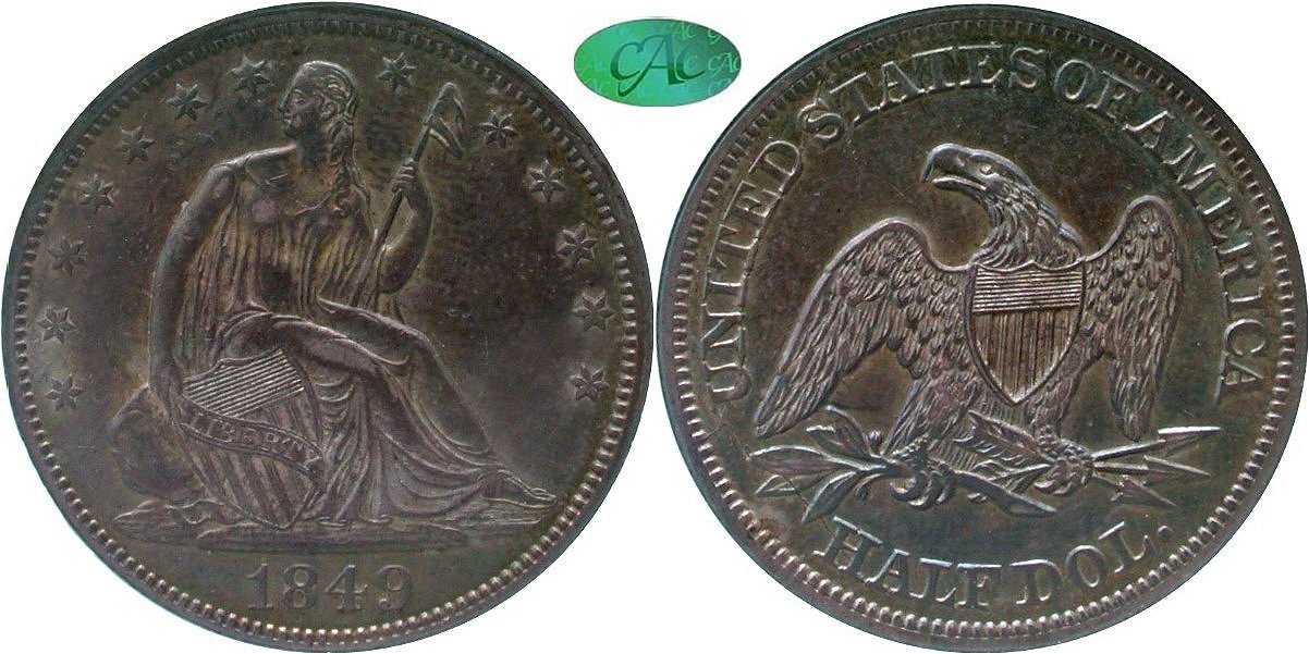 This is picture of a 1845 Seated Dollar obverse is graded as AU55. This is in my collection and I believe this coin was dipped a long time ago. The picture of the 1849 seated half I attached is also from my collection. It is a AU55 with it's original skin. They are nice examples but, the 1845 is not in it's original skin.