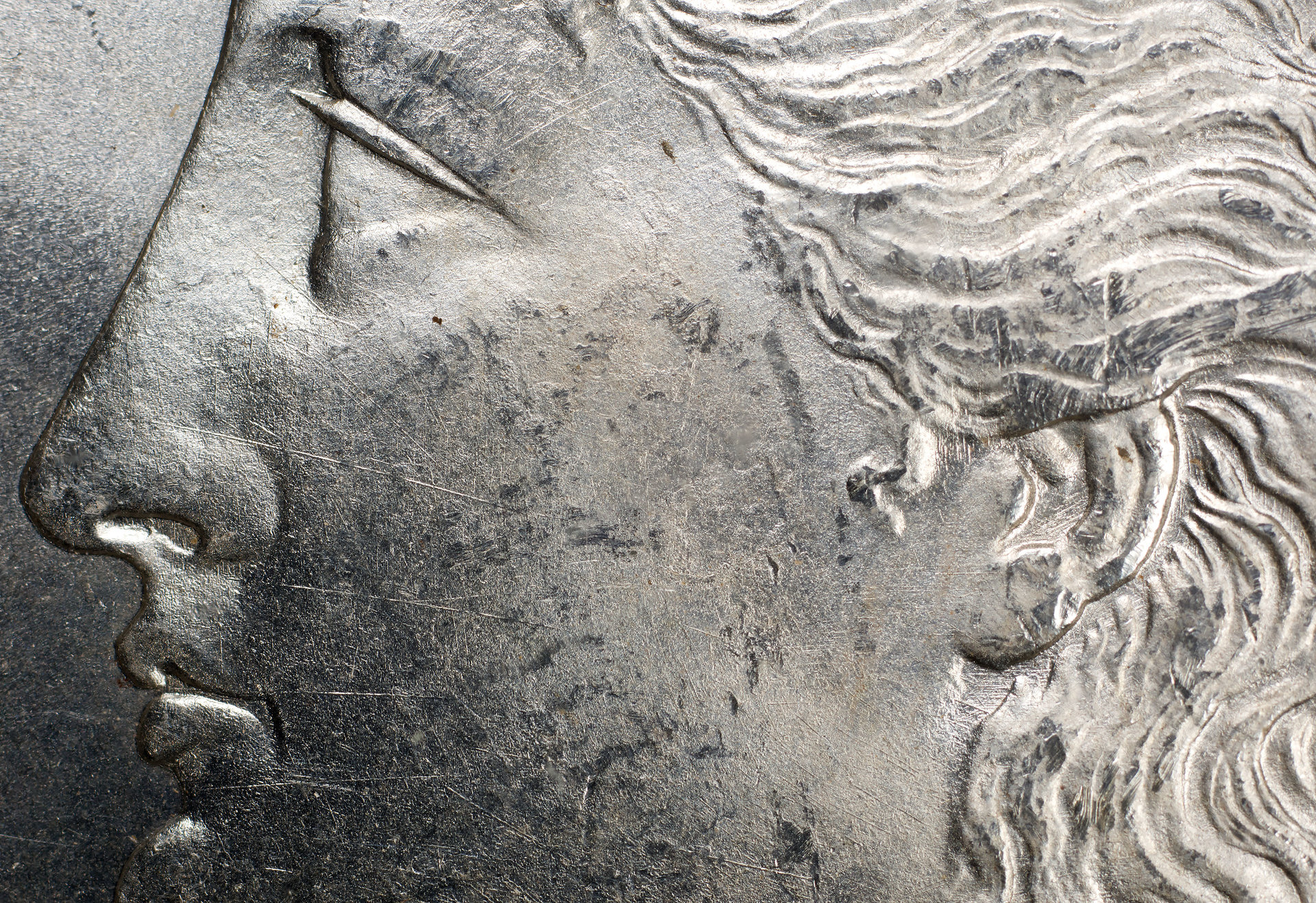 Here are some high detail shots of the cheek, nose and neck. You can really see the texture of the metal. The die was definitely rusty and had been worked prior to first use. @messydesk, I would love your input if any on this.
