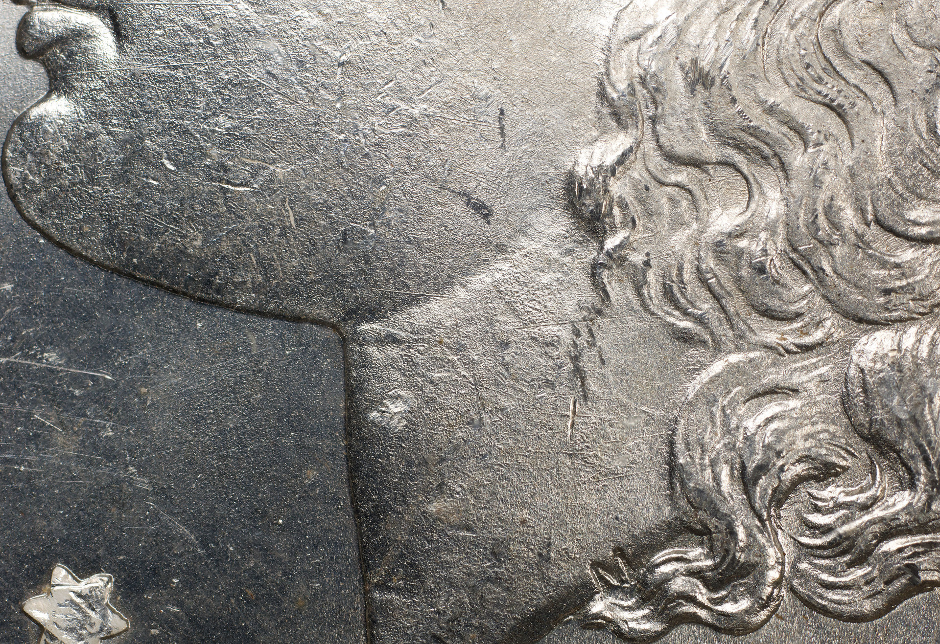 Neat die polishing lines on the portrait, for sure. Crisp die polishing lines are one sign of an early die state. 1886 dies were often used too long and detail becomes mushy and die polishing lines disappear. (Aside: I've started adding introductory paragraphs at the top of each date page on VAMWorld that touch on this, and 1886 is one I've done.) You'll usually see them in the spaces between the hair, but not as much on the face. Of course, they're more protected from being banged around in the hair recesses. There are a few specific hair recesses that have nicknames so that we can communicate where things are. There is the "D-shaped void", straight down from the ear and about 1/3 the way to the second 8, which is big enough to show a handful of scratches in a pattern that be matched, if necessary. The other is the "bear claw." If you draw a straight line from the top of the 6 to the bottom of the 2nd U in PLURIBUS, it's the "hairy paw" shaped end of a curl of hair about 1/5 the way from the 6 to the U, surrounded by lots of space to collect die scratches.