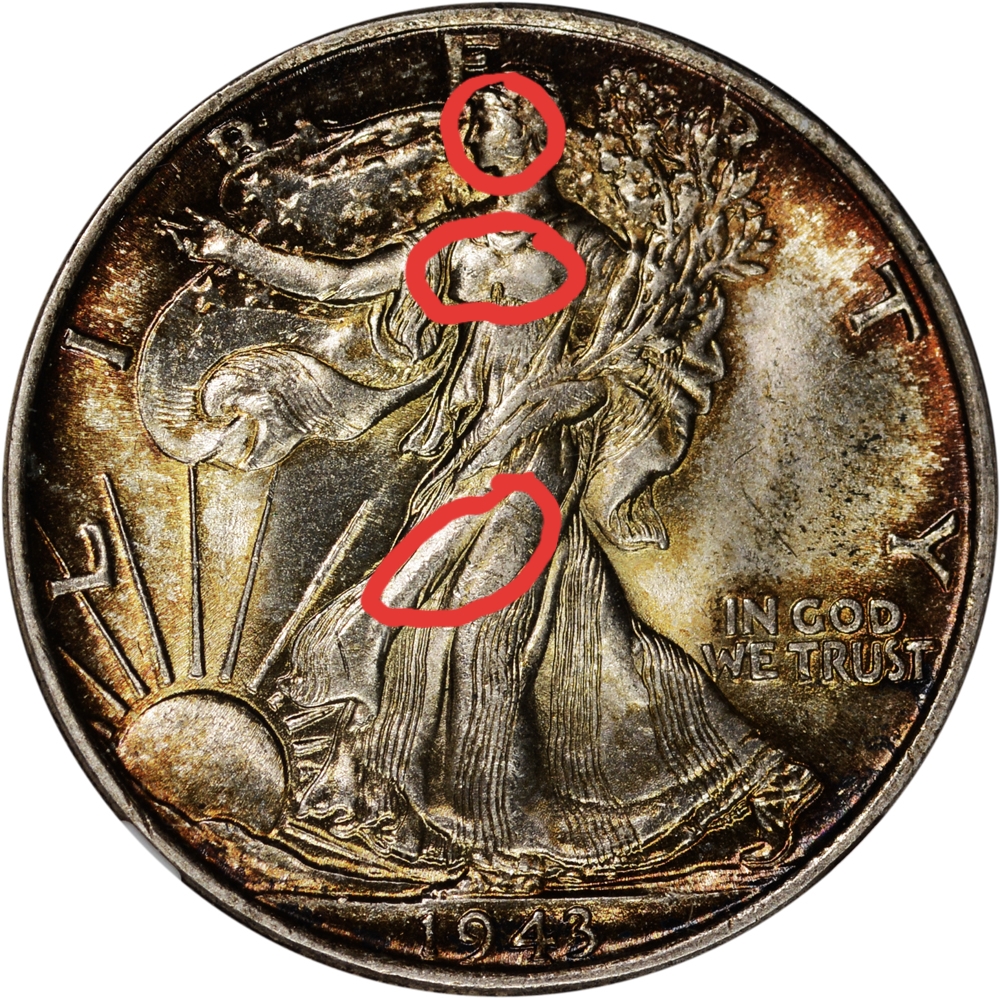 I gave my reasons for the 58, there is discoloration (could be toning or lighting) on the front part of the eagle's leg that could be wear, as on the breast and flag to the left of the leg of Liberty. If this was a blast white coin, would it make a difference in the grade? I dont know enough about grading, and in particular grading from a photograph this series yet (obviously). That is why I GTG (to learn). Micbraun points out these are typically weakly struck areas. So my walker below is NOT graded, but I have posted it before and it was commented on as between 53 and 58. There is very little toning on this one but is it wear or weakly struck in the same areas?