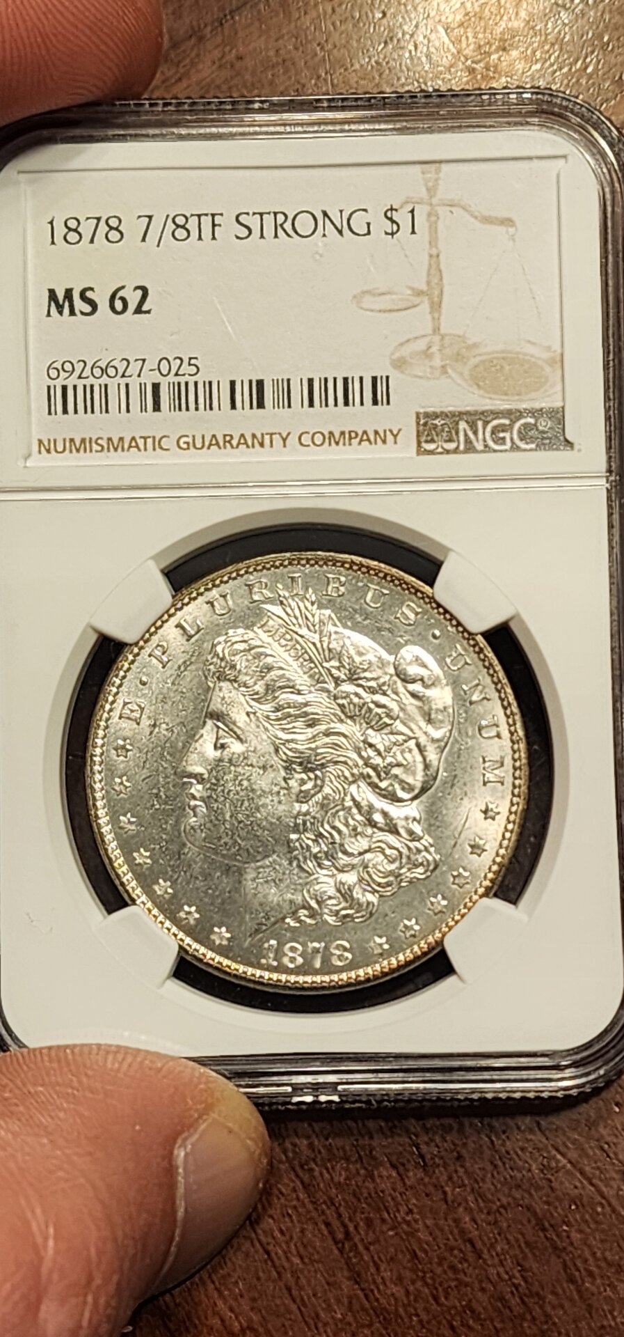 Following your lead, I couldn't pass this one up today. Could get details, IDK? What do you think about grade? Yours looks nicer. Paid a couple of bucks less than you but yours is a sure thing. 1878 7/8 strong, rim toning, raw. Will be interesting to see what PCGS thinks. Hoping that mark just under the jaw doesn't get a scratch detail. This is the best I could do with sellers photos.