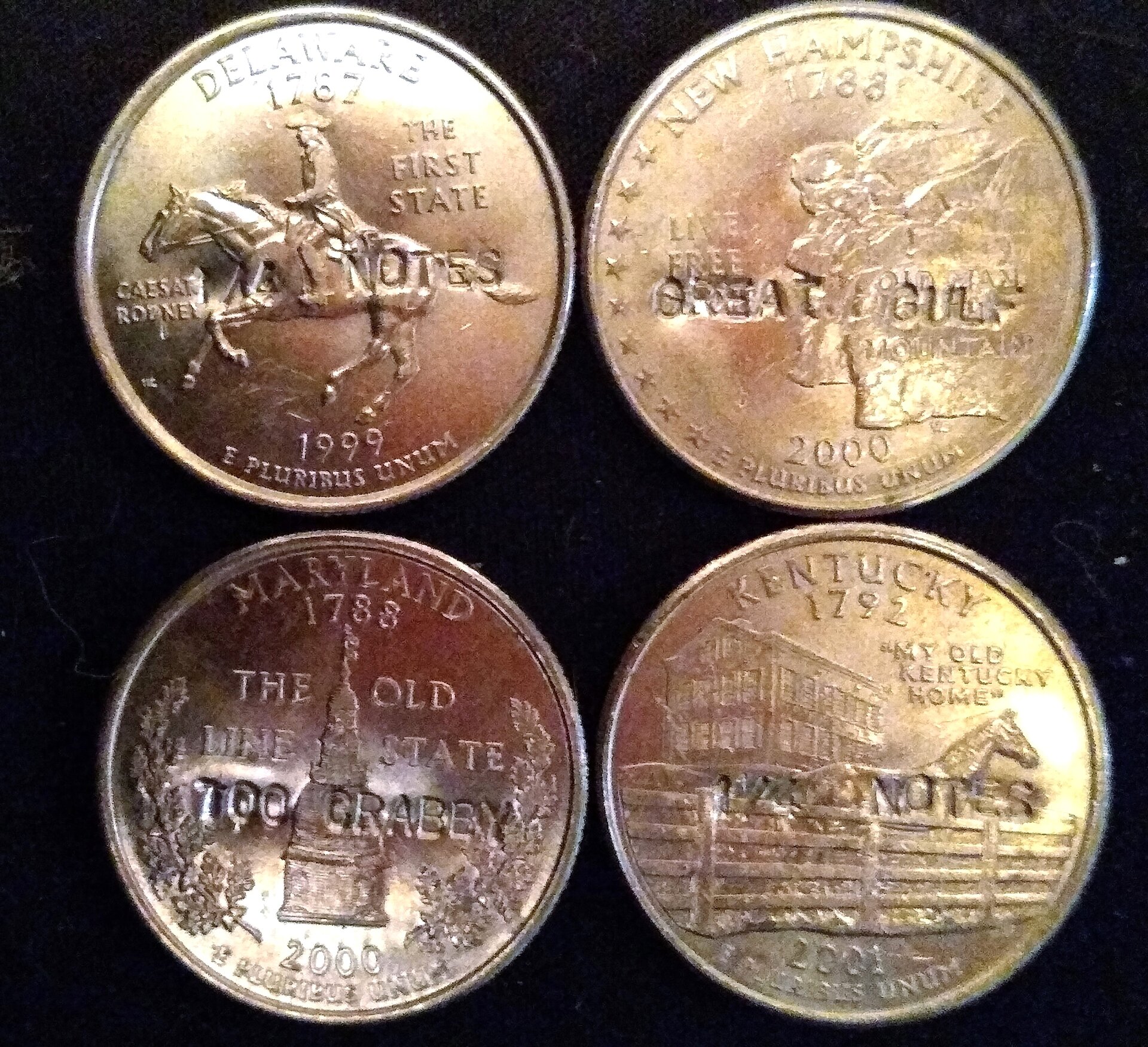 Hey everyone! I won these from one of Lord M.'s Contests. I need a little help deciphering what they are. This is a "For Fun" thread. NO Prizes. Sorry. Bragging rights maybe? 1. Delaware- Quarter Notes 2.New Hampshire- Great Gulf 3. Maryland- Too Crabby 4. Kentucky- Quarter Notes Thanks for reading and hopefully participating!! Stay tuned for Part 2!