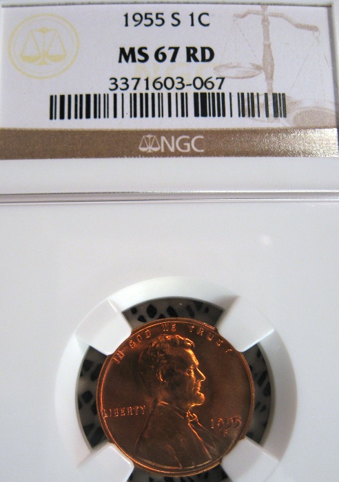 I am sorry, I put the wrong slab picture up earlier. (Now corrected.) As I explained here http://www.cointalk.com/t193164/#post1282144, the 66 then or 67 this time is not the grade, but the slab number. I is merely a way for me to distinguish between the different slabs. If you have not figured it out yet, not all of these coins are in my collection. Several of them either are for sale or have been sold. This is the third 1955-S I have posted and I still have 4 more. However, I only have 2 of those in my collection. I needed some way to keep track of which picture was which slab and I chose the last digits of the slab number. It just so happens that this coin got named 67 (and the earlier was a 66).