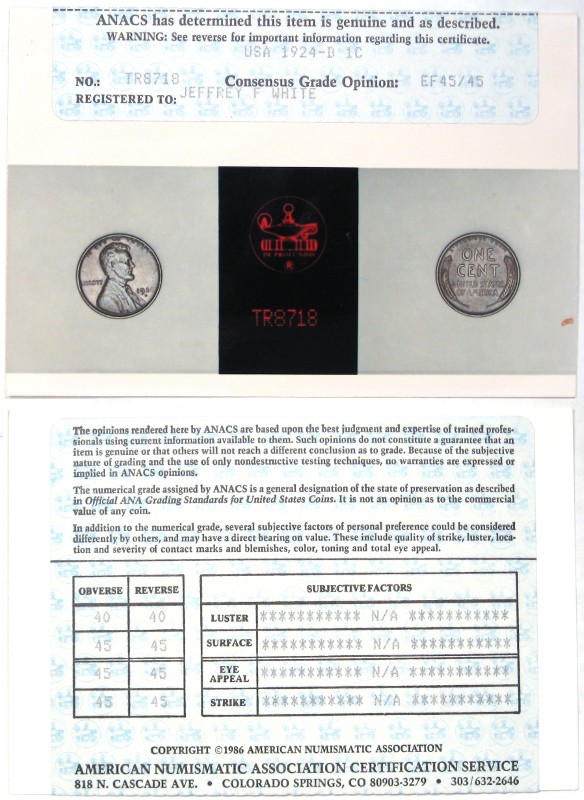 I am not sure I quite understand ANACS evaluation. They grade strike? You can deduct for it, but grade it? Luster for an XF coin (or maybe that is what they are saying with the 40)? Anyhow, the 24-D is well known for crappy strikes. This is not one of them. Very clean with no distracting marks. My initial appraisal of this was a solid 45, but after looking at the PCGS photograde samples, it might have a shot at a 50. ANACS called it a 45.