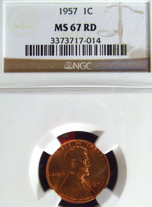 Super strike, nice luster, and I can only mange to find one little nick and that nick is between the wheat stem and the rim where it pretty much does not count. This is one where I need to follow my own advice. In hand with a loupe, you can see several tiny brownish streaks. Without the loupe, it looks all red. Anyway, as most of you guess, NGC gave this a 67. I might be a bit marginal, but I have to agree with them. BTW, this is now the highest point coin in my collection on the NGC registry.