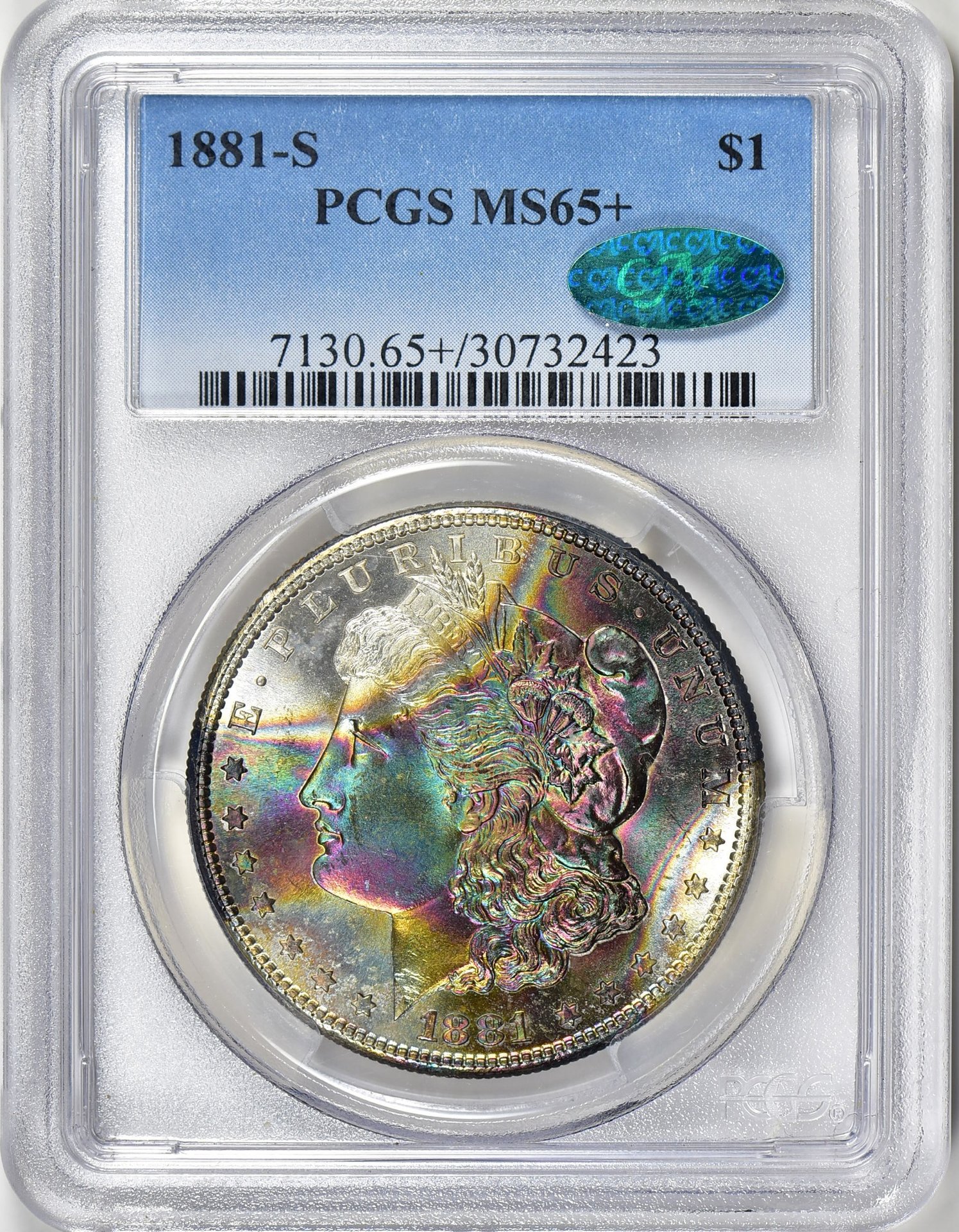 Well this was a tricky one as there were three possible answers! Congrats if you guessed any of the following: MS 65+ , 67+ , or 68 ! https://www.greatcollections.com/Coin/339820/1881-S-Morgan-Silver-Dollar-PCGS-MS-65-CAC-Toned https://coins.ha.com/itm/morgan-dol...6-4968.s?ic4=ListView-ShortDescription-071515 https://www.pcgs.com/cert/35823232