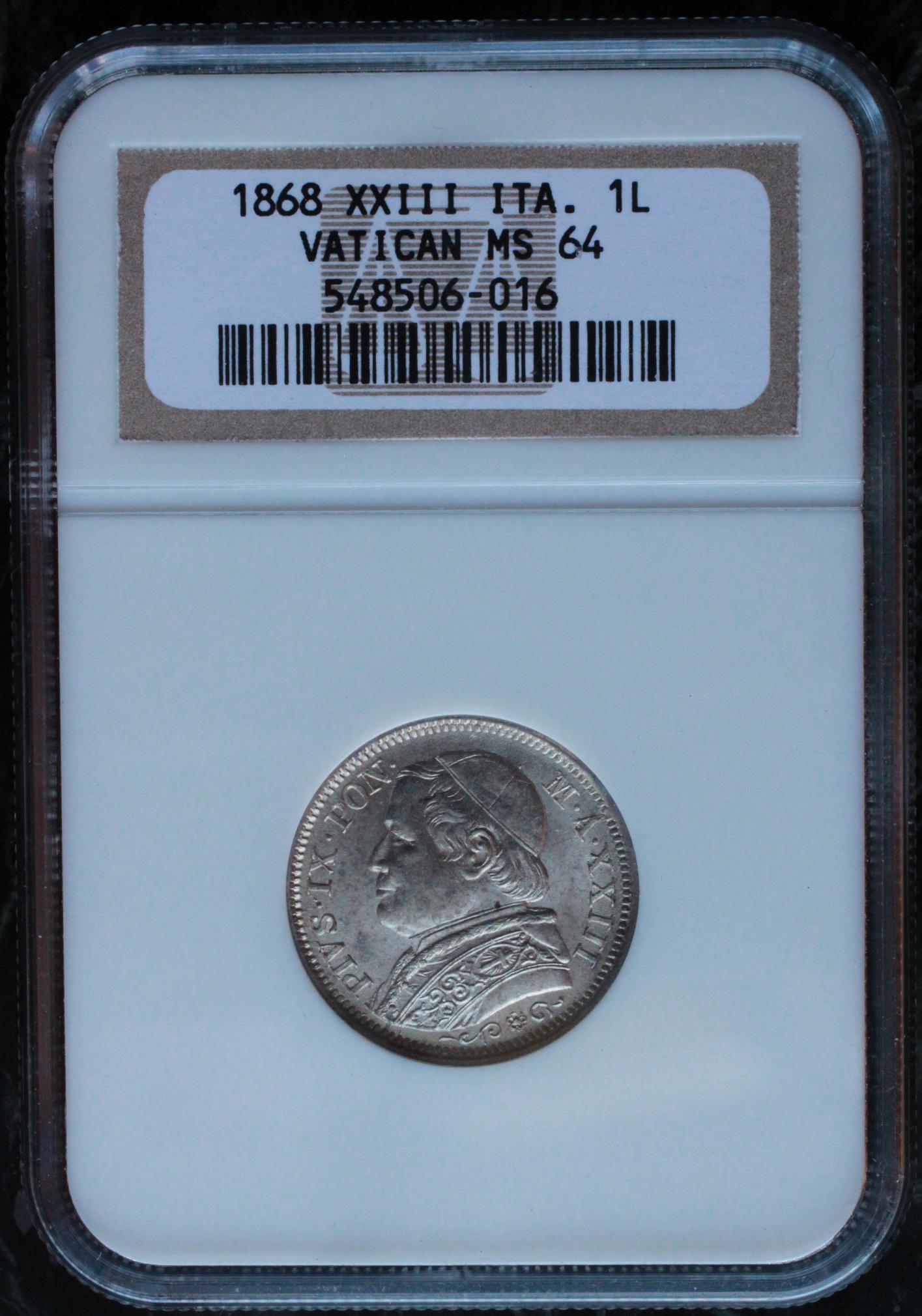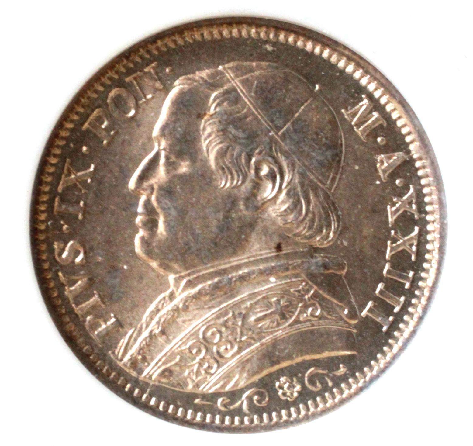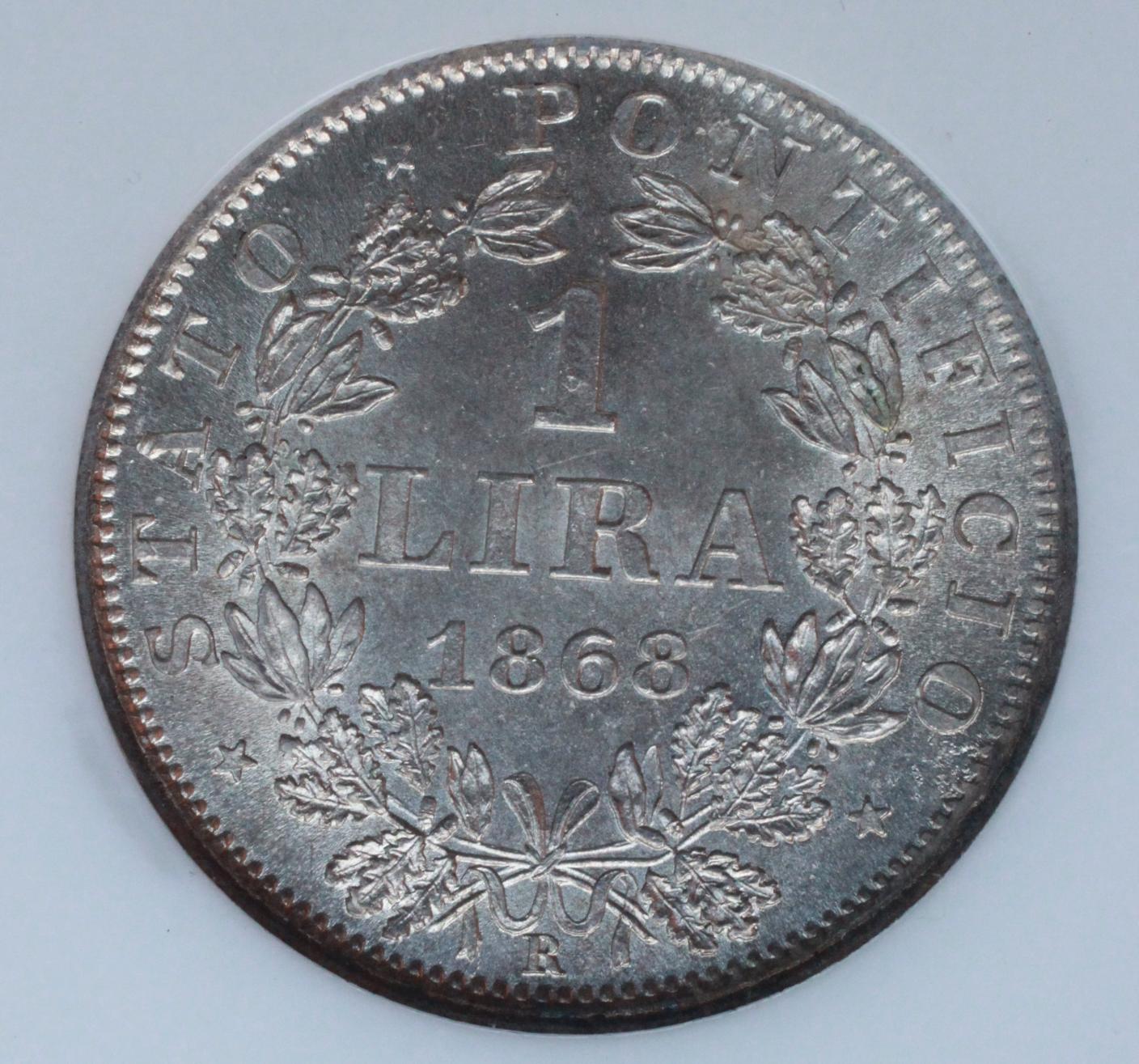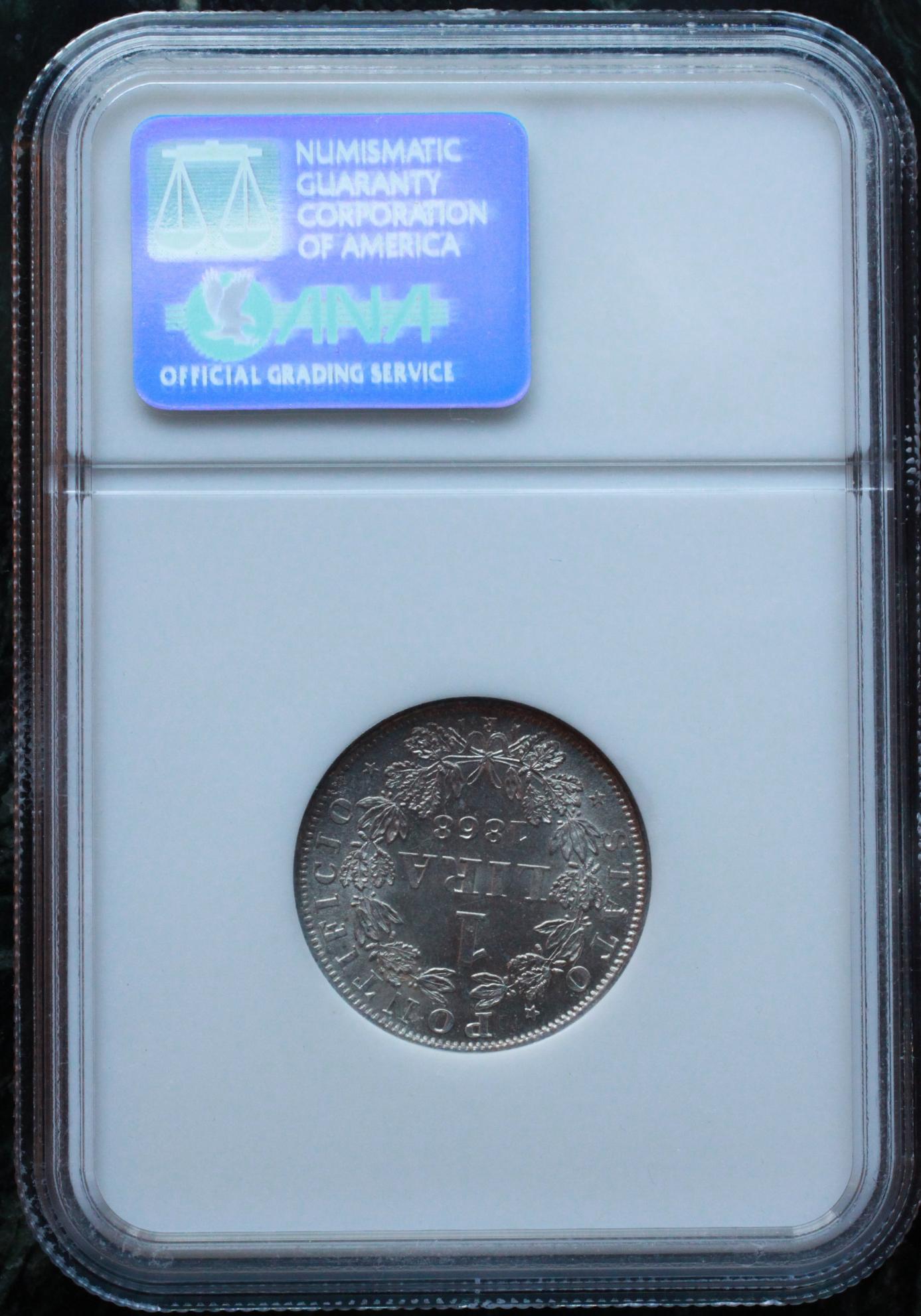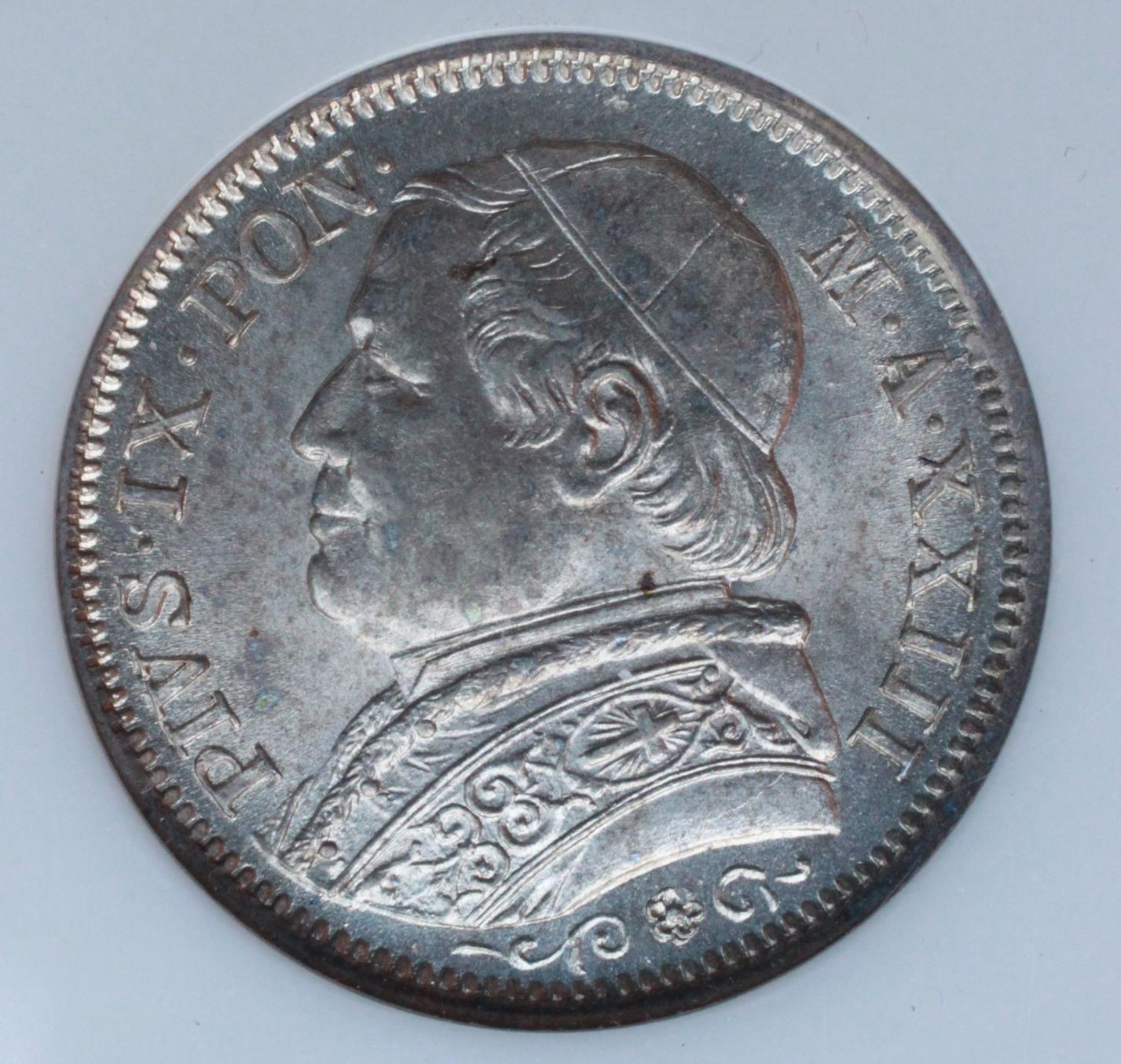 Given the luster one can see in the large pictures, particularly around the periphery, I'm going with higher than what anyone else has said here so far. And, that surprises me, as I'm usually a bit of a conservative world coin grader compared to NGC. I'm going with MS64. I think what looks like possible rub on the hair is actually oddly captured spotting because of poor (diffuse) lighting in the image. The coin is rich with detail on the pope's collar, and the reverse is superb. Pity about those two dark spots. Better images would of course make the grading a bit more accurate.