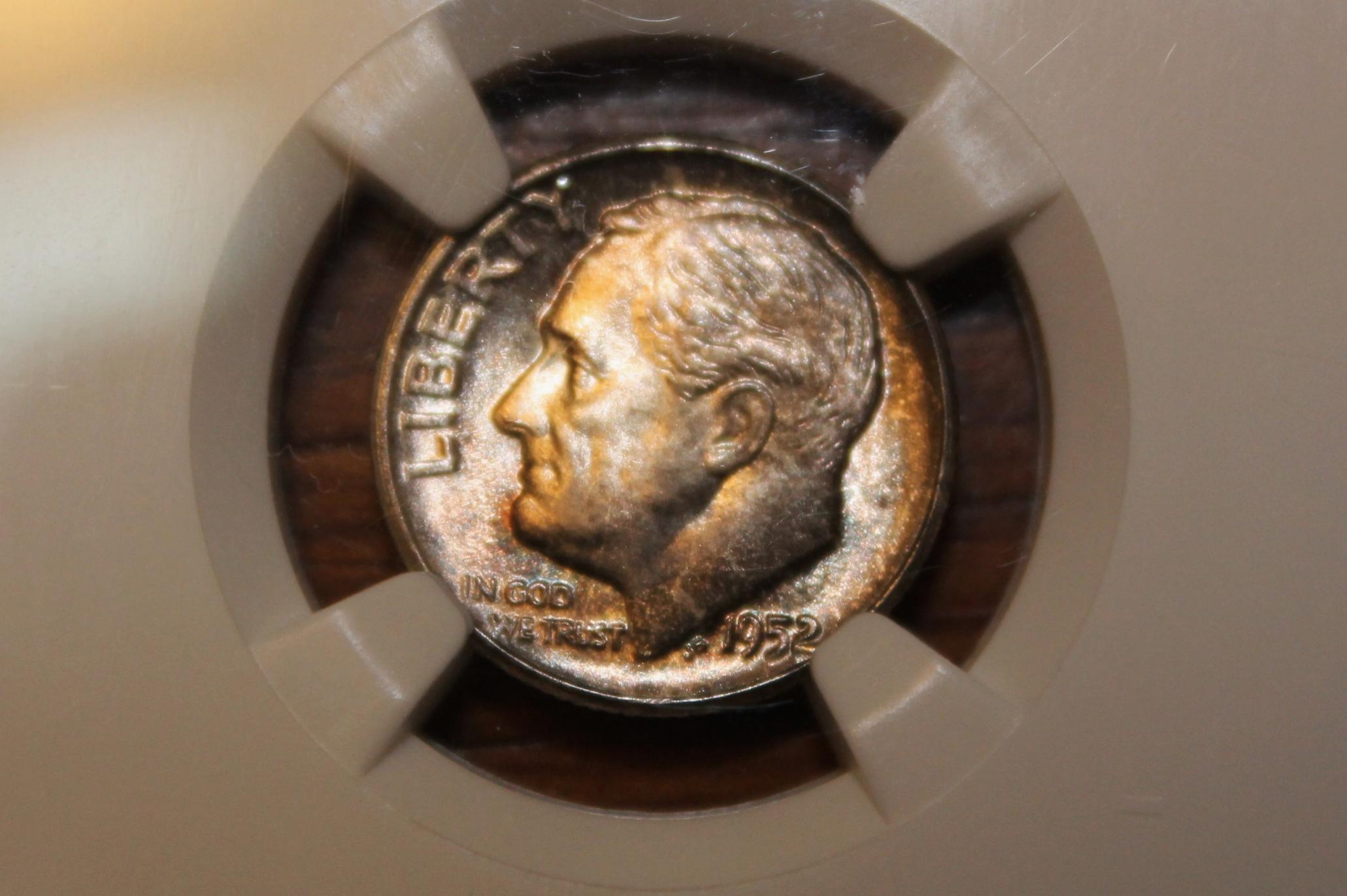 Dimes are't my thing either and the dark spotty toning keeps me from getting a feel for the luster to make a guess. I will swag it 66 just for that hit on the torch.
