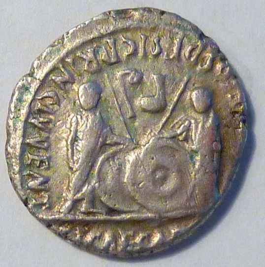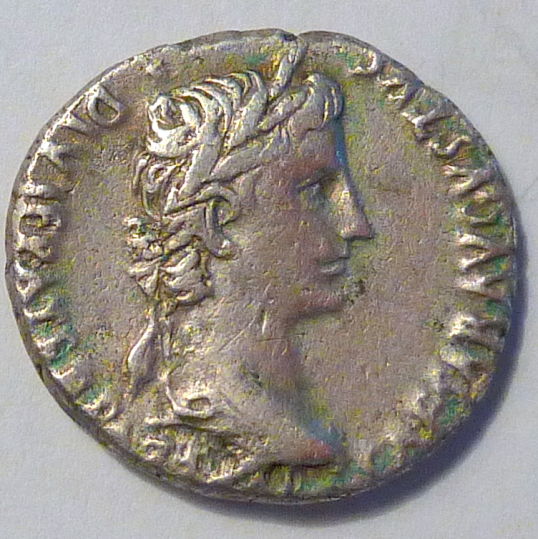 How about Augustus: AR Denarius OBV: CAESAR AVGVSTVS DIVI F PATER PATRIAE. laureate head right REV: AVGVSTI F COS DESIG PRINC IVVENT, C L CAESARES below, Gaius & Lucius standing front with shields & spears; in field above, a simpulum & lituus (in "Pd" formation) Struck at Lugdunum, 4-2 BC 3.5g, 18mm RIC 210