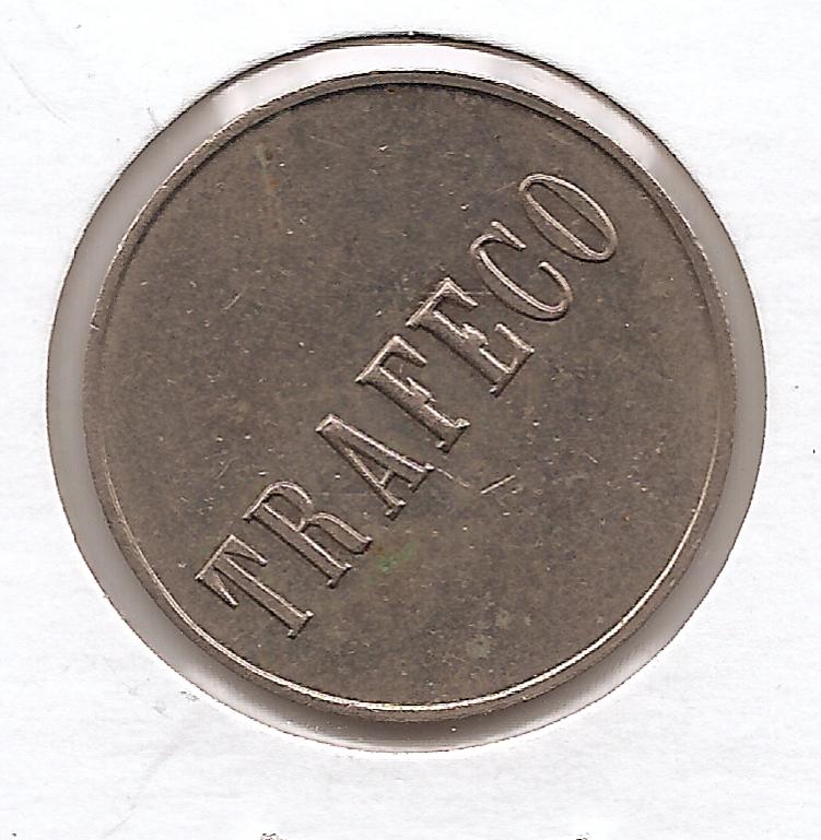I have the same coin! I just found the same coin / token in a jar full of antique buttons. It says TRAFECO on the back and has some sort of box on the front that says LG. Like a TV or fridge? who knows. I have NO IDEA what it's from. If you found out, could you let me know? I'm terribly curious.