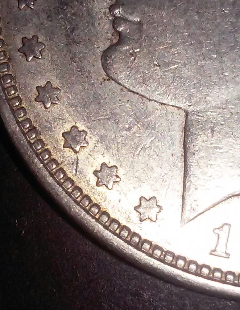 The breaks, or maybe better called die cracks, run along the bottom of the 19 in the date, as well as the stars to the left of the date, and go into the denticles. I know that they do not assign a VAM solely on a die crack or break; I was just hoping a seasoned VAMmer would recognize them as markers for a particular VAM.