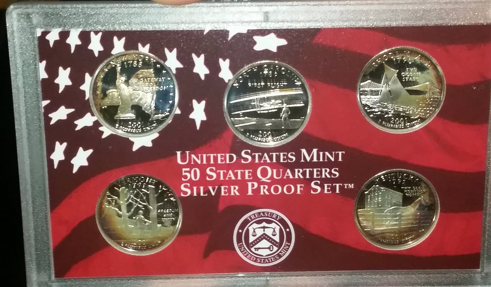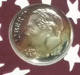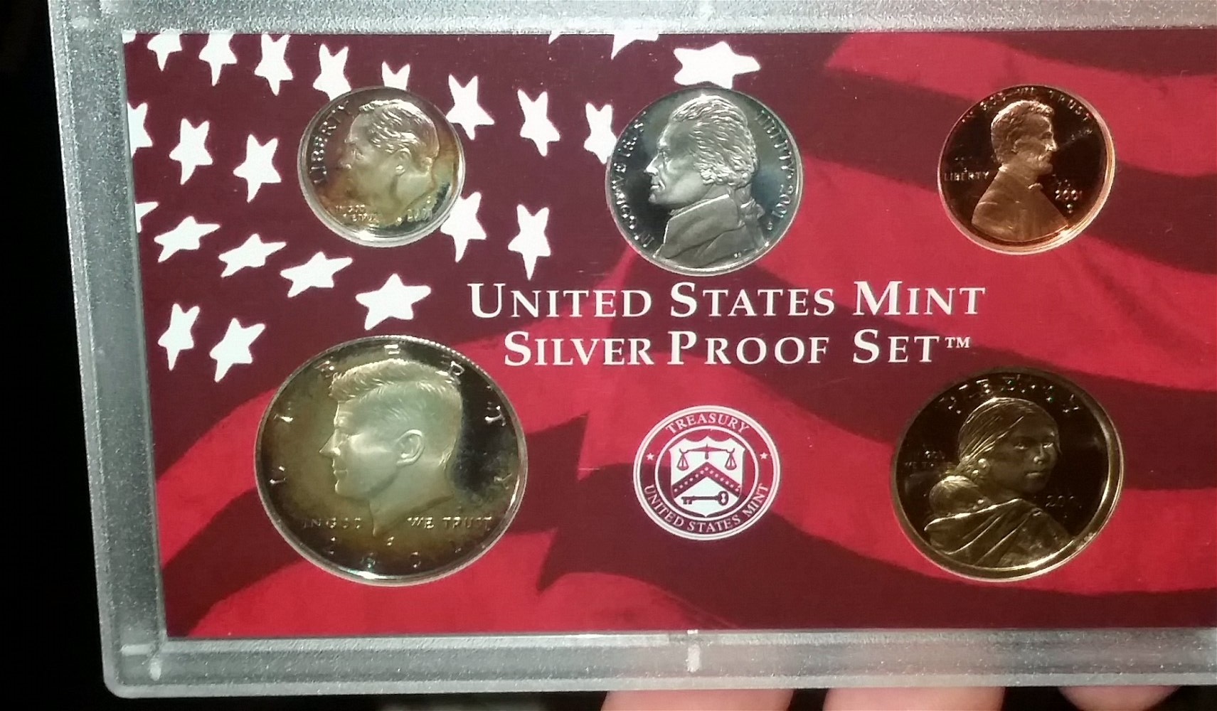 it might look like this 20 years later, my 2001 S silver proof that had haze: and it's still creeping. To be fair though, I'm not good at photographing toning yet, it goes from a golden to dark red... I'm hopeful blues will be the next colors to appear in the next 5 years or so. right now it's light gold, amber, russet, and burgundy I'm wishing the blues will start appearing. personally, i think it has to do with climate control during the initial shipping of the coins to you from the mint, at least that's how I think mine occurred. maybe left on a cold truck overnight, then they driver kicked on the heater in the morning for the route an condensation. I'm going to try ideal lighting someday to see about getting the colors to show up better. it does look better than this picture lets on to but in the absolute wrong light it's a dog. Oh and the picture's through the proof set lens also. the set itself, and the other side isn't nearly as bad as these sides the cent and SAC have no issue at all. its like the side that was inside facing with the COA didn't take the hit so bad as the sides towards the outer carton of the package, but like I said, mine came hazed lightly from the mint and I've let it ride for 20 years somewhat climate controlled, not going out of my way to remove any humidity, but not doing anything purposely either to add it.